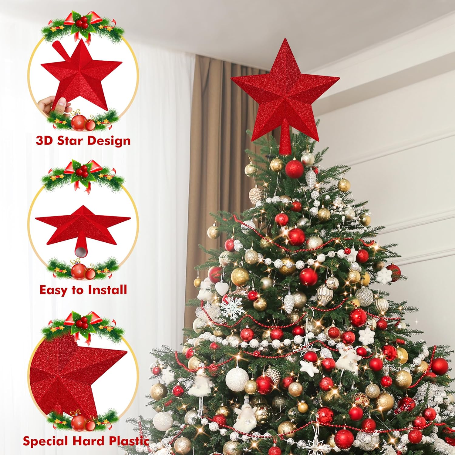 Star Tree Topper, 10" Red Christmas Tee Topper Decorations, Glitter 3D Xmas Bethlehem Star Waterproof Shatter-Proof, Christmas Tree Topper Ornament Decor for Christmas Holiday Party Indoor Outdoor