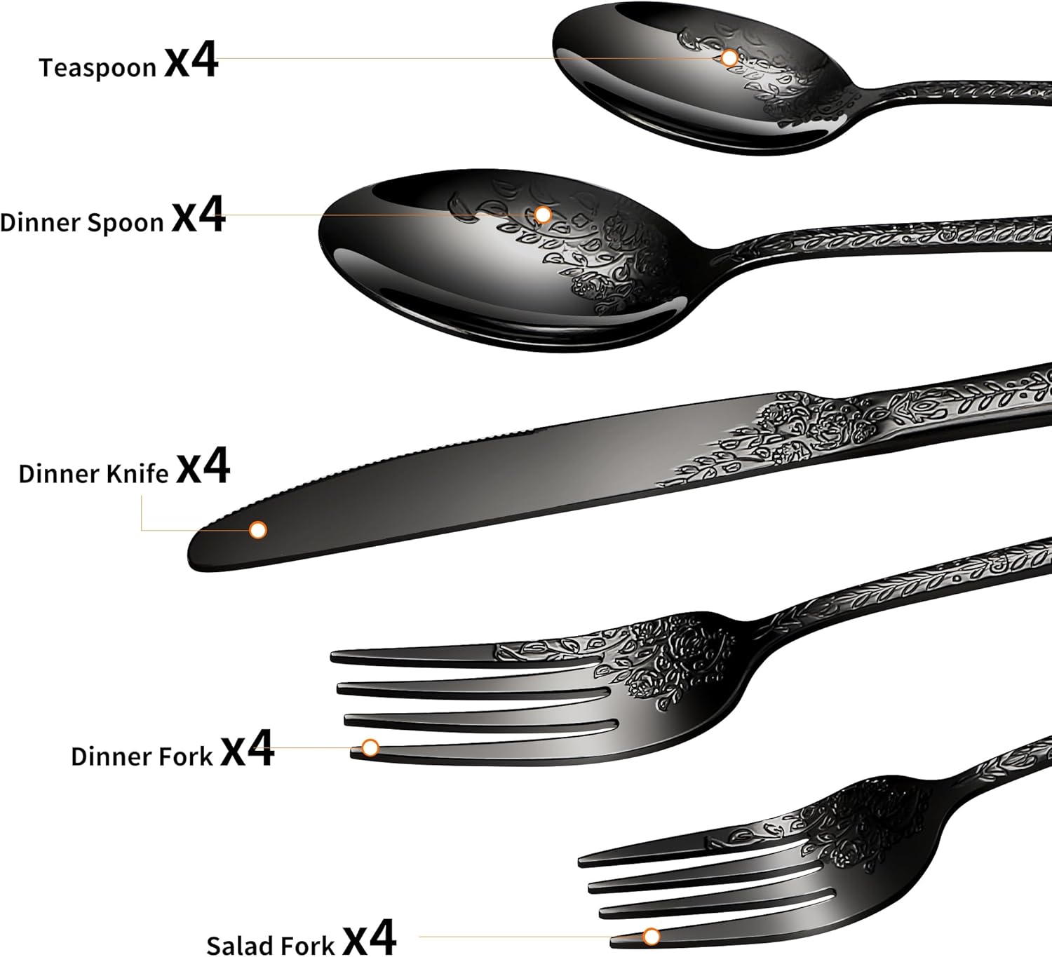 - WONDERFUL WORKMANSHIP AND FUNCTIONAL---Our black utensils set is made of multiple mirror polishing treatment,black silverware set with floral design Each piece is beautifully adorned with a delicate floral pattern,edge smooth , elegant and classical appearance, adding to the beautiful experience of everyday dining.