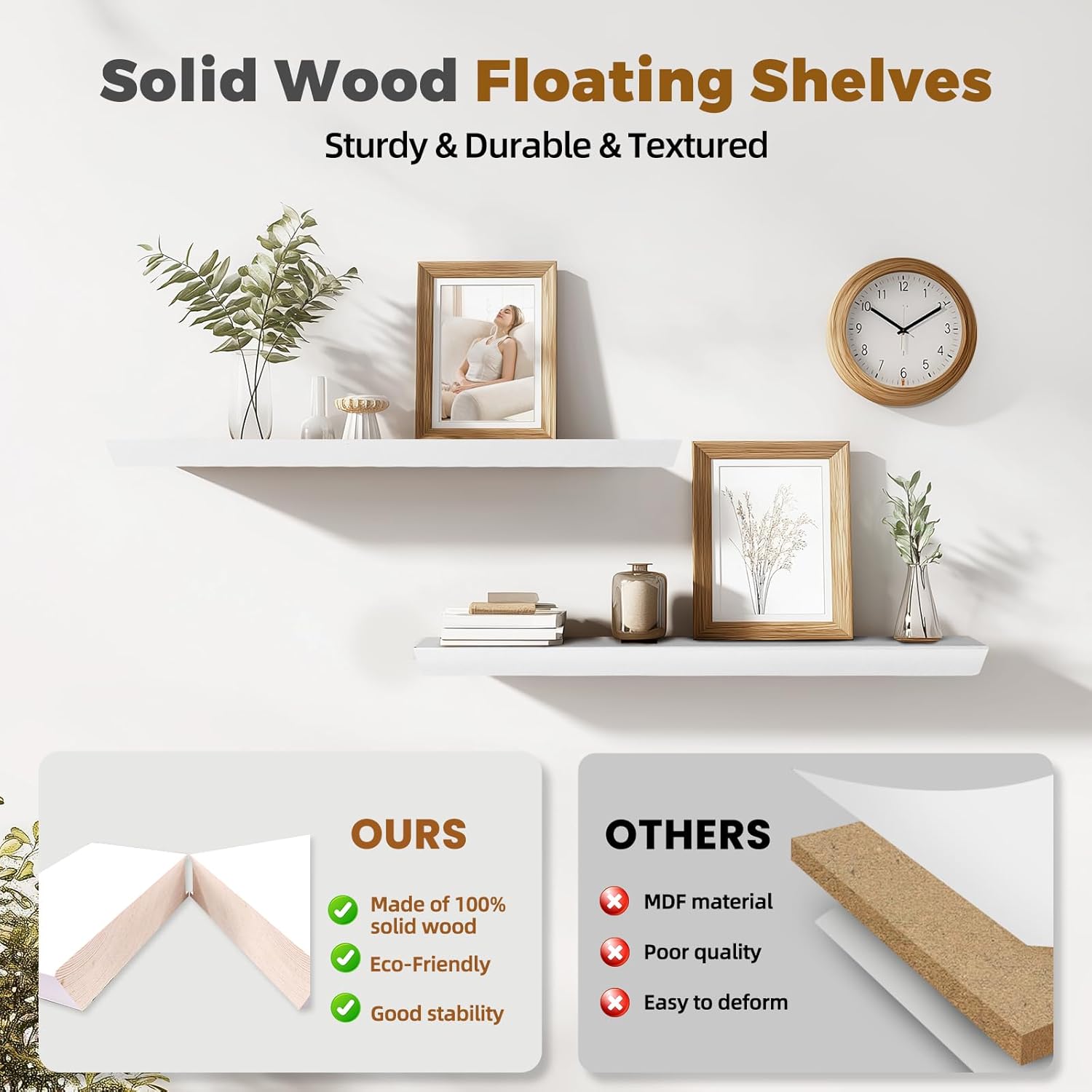 36"x6.8"x1.6" Slanted Floating Wall Shelves 2-Pack - Rustic White Finish, Heavy-Duty Solid Wood Design with Hidden Brackets - Perfect for Living Room, Kitchen, Bathroom, or Office