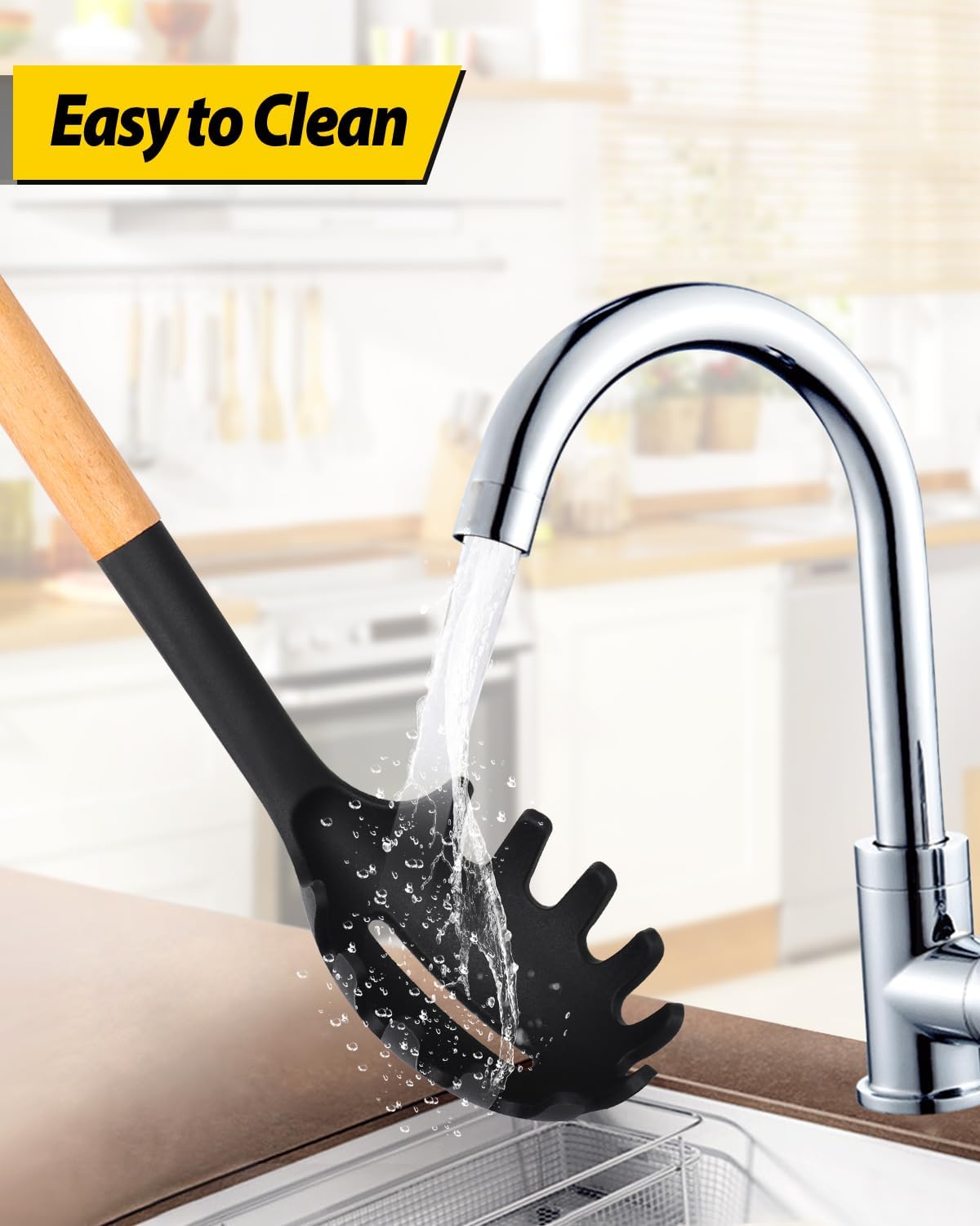 Silicone Pasta Fork and Ladle Spoon Set with Wooden Handle, Heat Resistant Non Stick Kitchen Utensils for Cooking, Stirring, Serving Spaghetti, Soup, Sauce(BLACK)