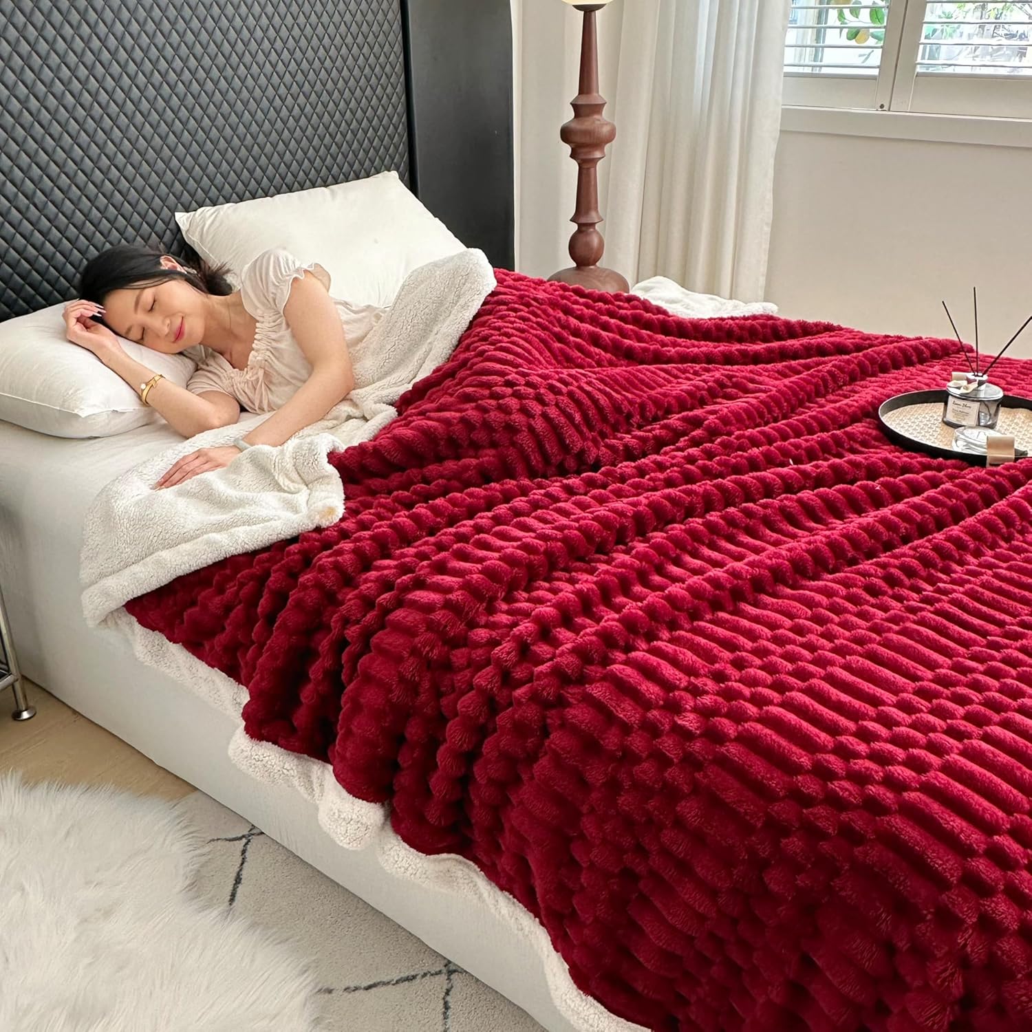 UKELER Sherpa Bed Blanket 80 × 90 inch, Ultra Soft Queen Size Throw Blanket for All Season, 470 GSM Cozy Plush Striped Fleece Blankets for Bedroom Living Room Dorm Hostel Sofa Camping, Red