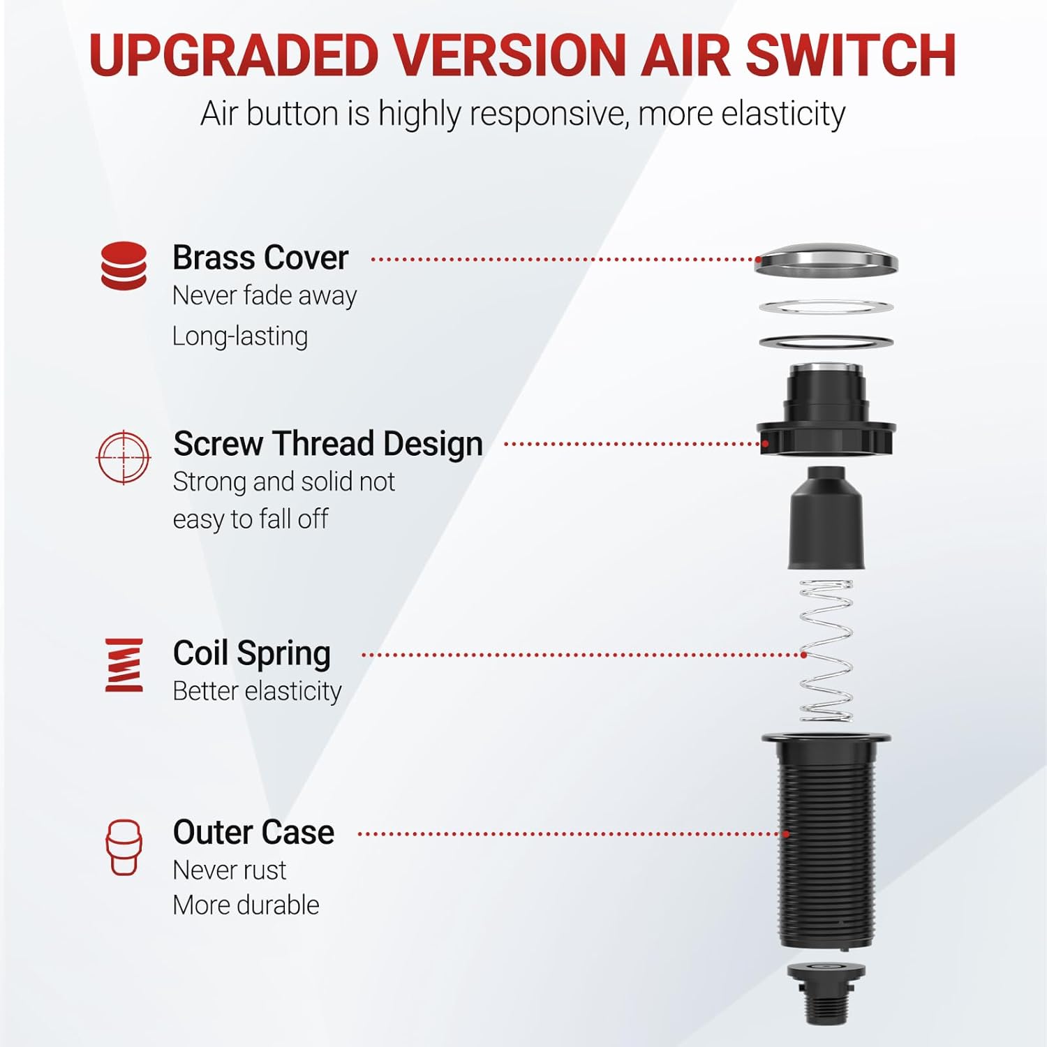 - Garbage Disposal Switch: This garbage disposal comes with an air switch that allows you to control your garbage disposal with the push of a button, helping you keep your kitchen clean quickly and easily.