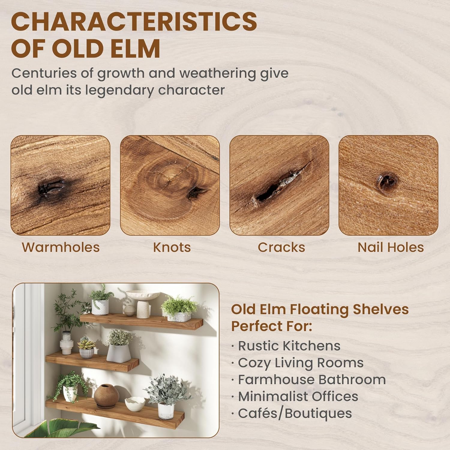 - REAL SOLID ELM WOOD: These elegant elm wood floating shelves showcase the natural beauty of solid timber with a clean, minimalist design. The rich, warm tones and distinctive grain patterns of elm create organic visual interest, while the smooth, sanded surface offers a soft tactile feel.