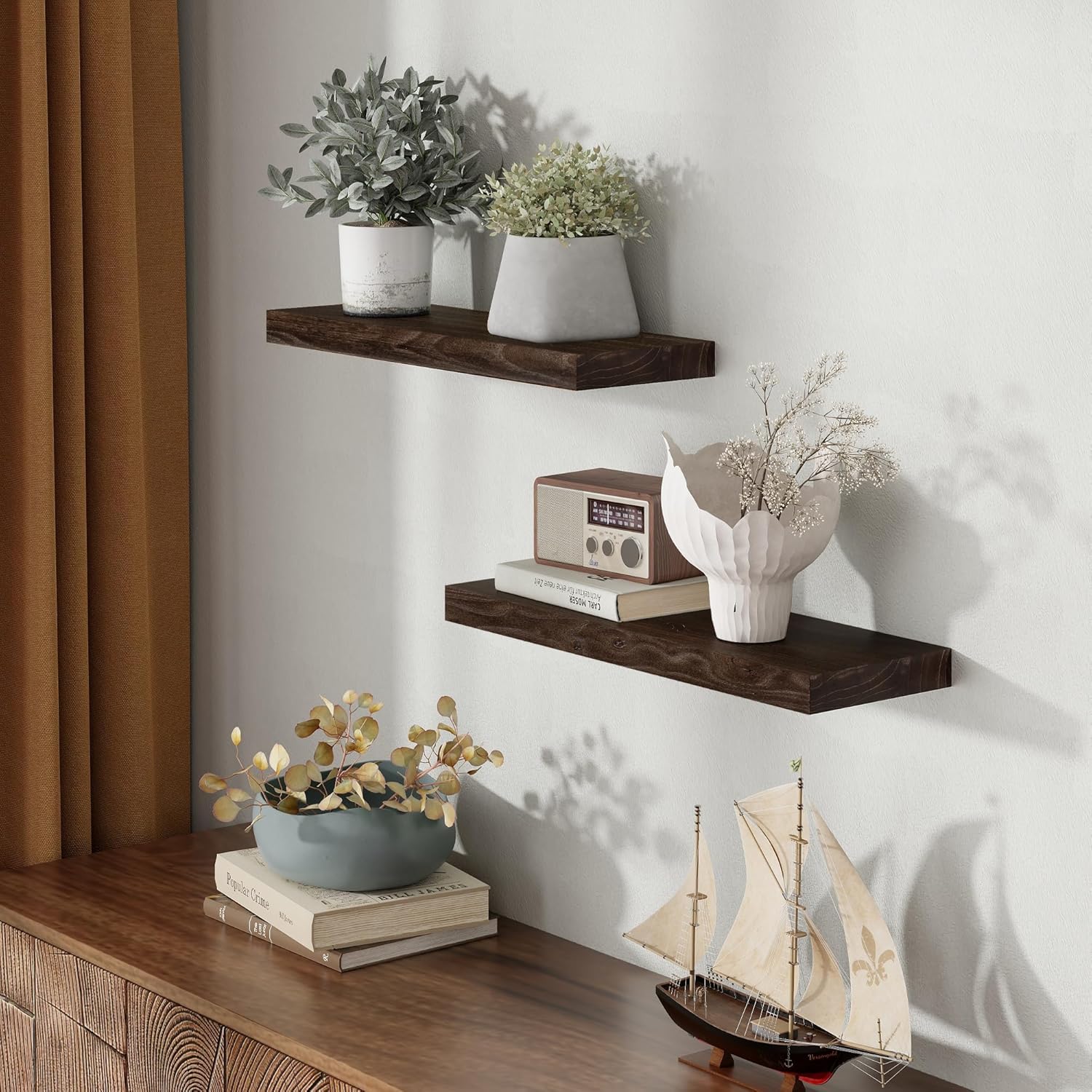 Wood Floating Shelves for Wall, 24" Floating Shelves Wall Mounted, Rustic Old Elm Wood Shelves for Home Decor, Heavy-Duty Storage Shelves for Books, Bathroom, Kitchen, Walnut Color, Set of 2