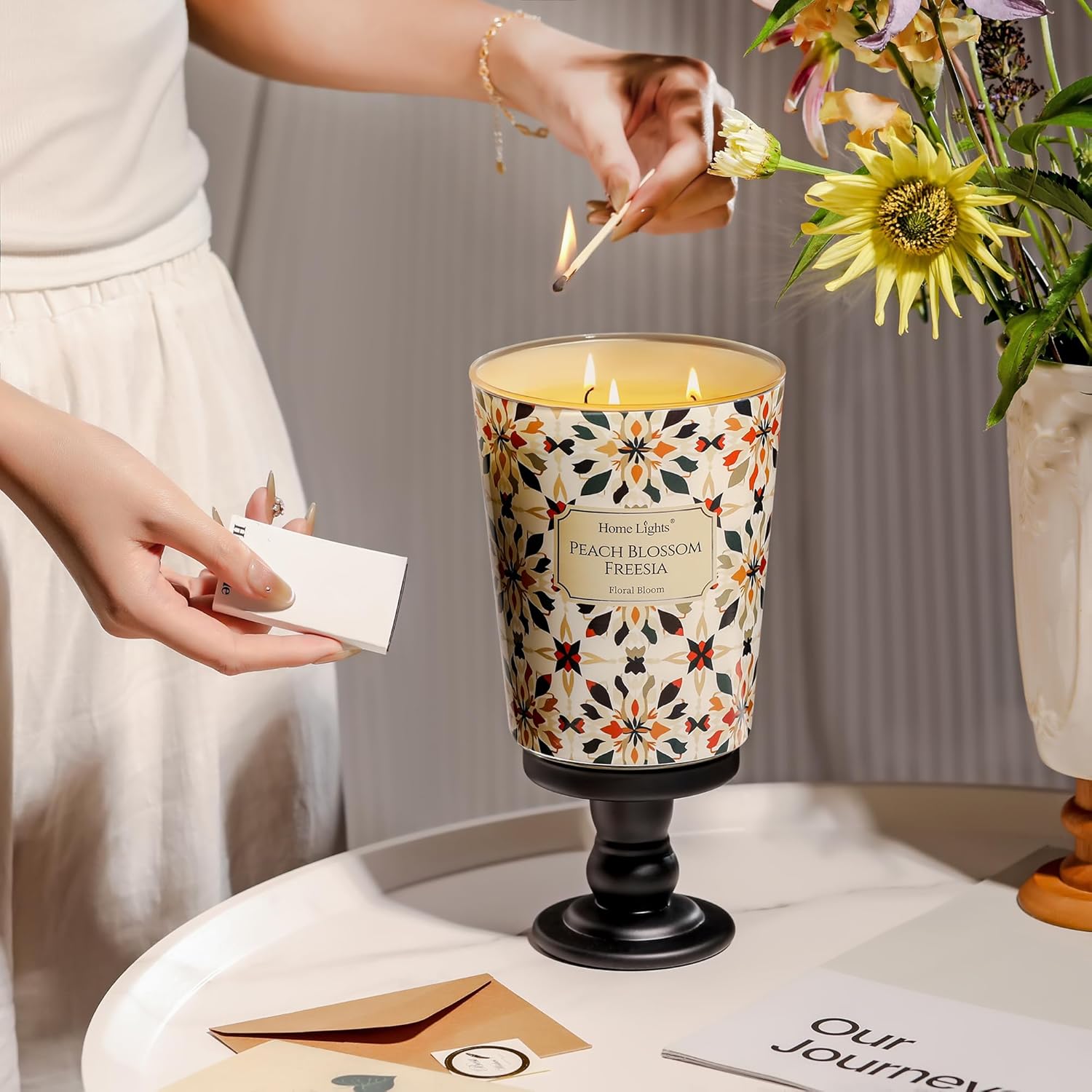 HomeLights 3-Wick Candles for Home Scented - 34oz Soy Wax Blend Candle Long-Lasting Fragrance, Bohemian Natural Textures Home Decor and Housewarming Gifts, Peach Blossom Freesia