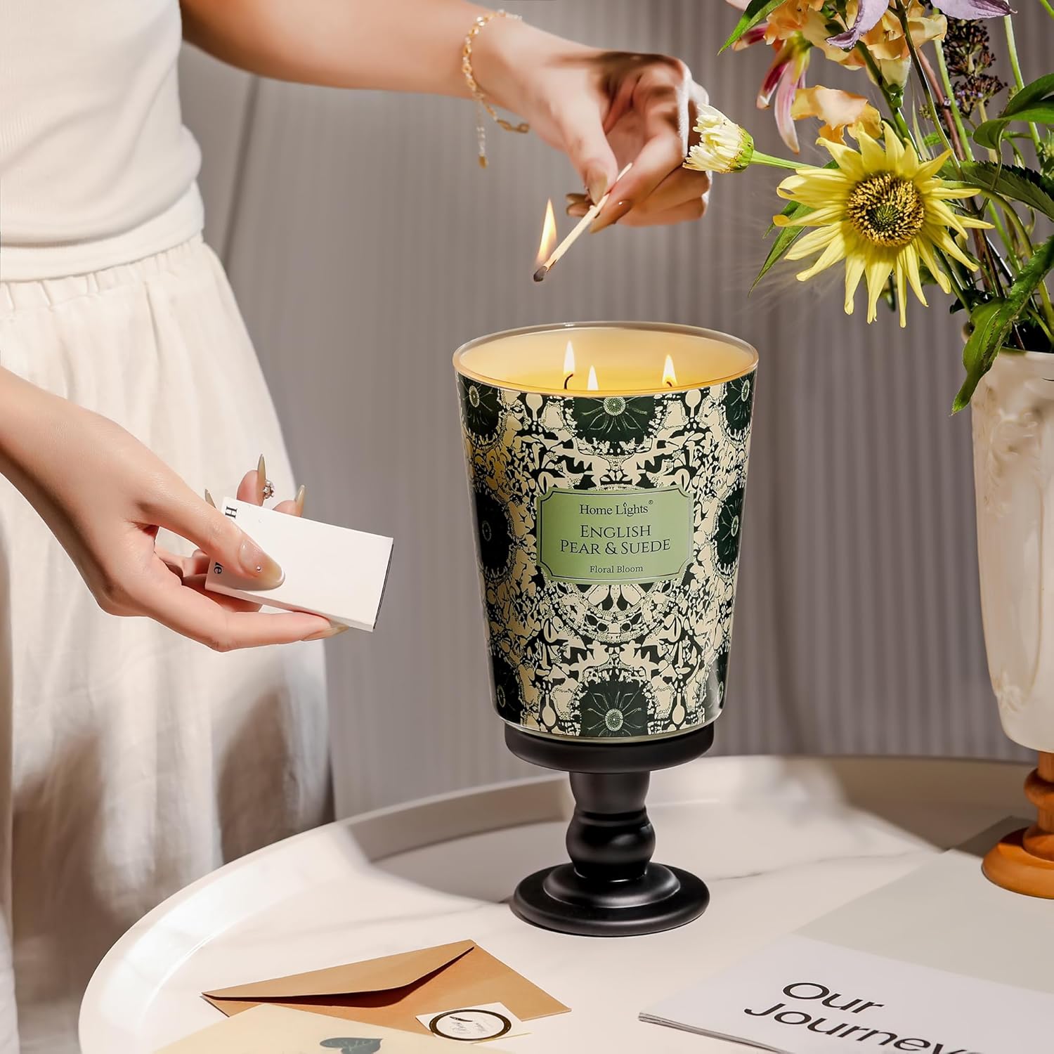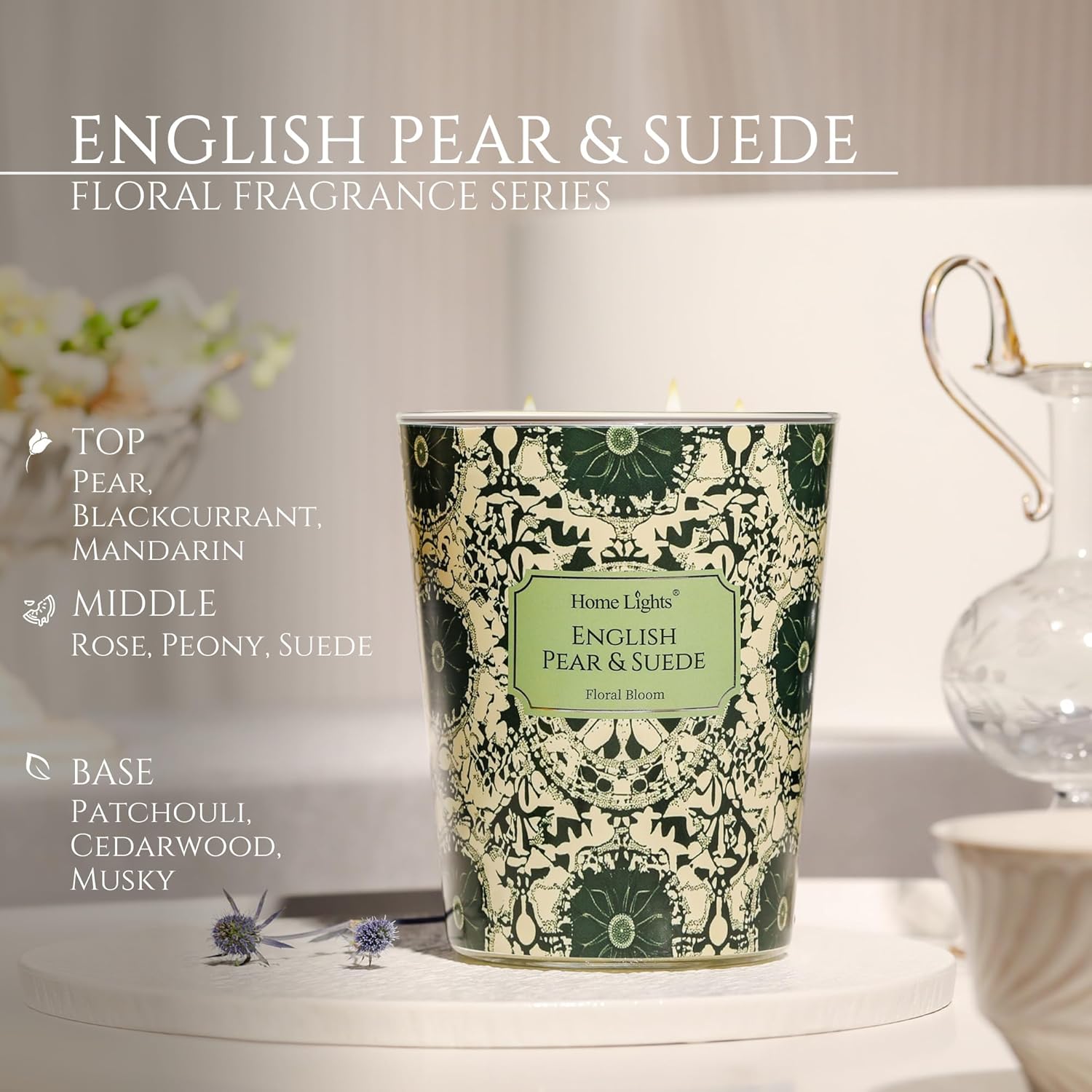 - 【English Pear & Suede Fragrance for Relaxation】3-Wick Candles capture the essence of English Pear & Suede with its fresh, juicy top notes of ripe pear, a heart of soft suede, and a warm, woody base of amber and patchouli. Perfect for cultivating a serene ambiance in living rooms, bedrooms, or bathrooms.