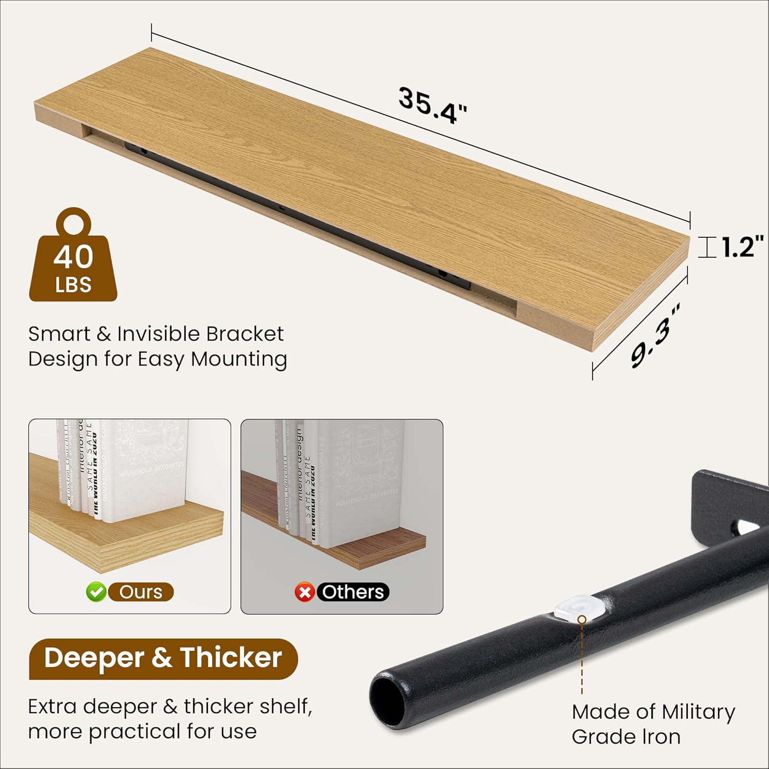 - Rustic Wooden Floating Shelves: Crafted from sturdy MDF, these floating shelves (35.4" W x 9.3" D x 1.2" H) feature robust iron brackets that support up to 40 lbs. The durable build provides a reliable surface for displaying photos, trophies,and decorative items