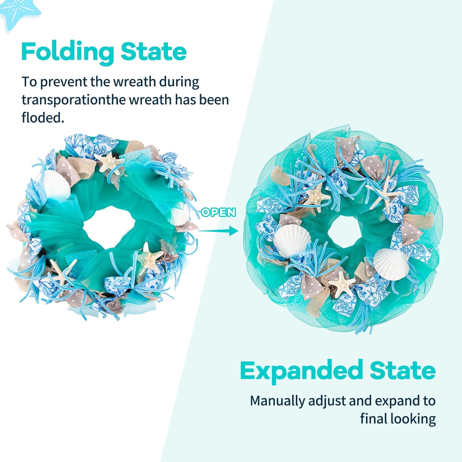 - 【Perfect for Any Space & Season】Whether hung on your front door, porch, living room wall, or used as a wedding or party backdrop, this wreath offers year-round beauty. Its durable construction and refreshing seaside colors make it suitable for spring, summer, and even beach-themed winter decor.
