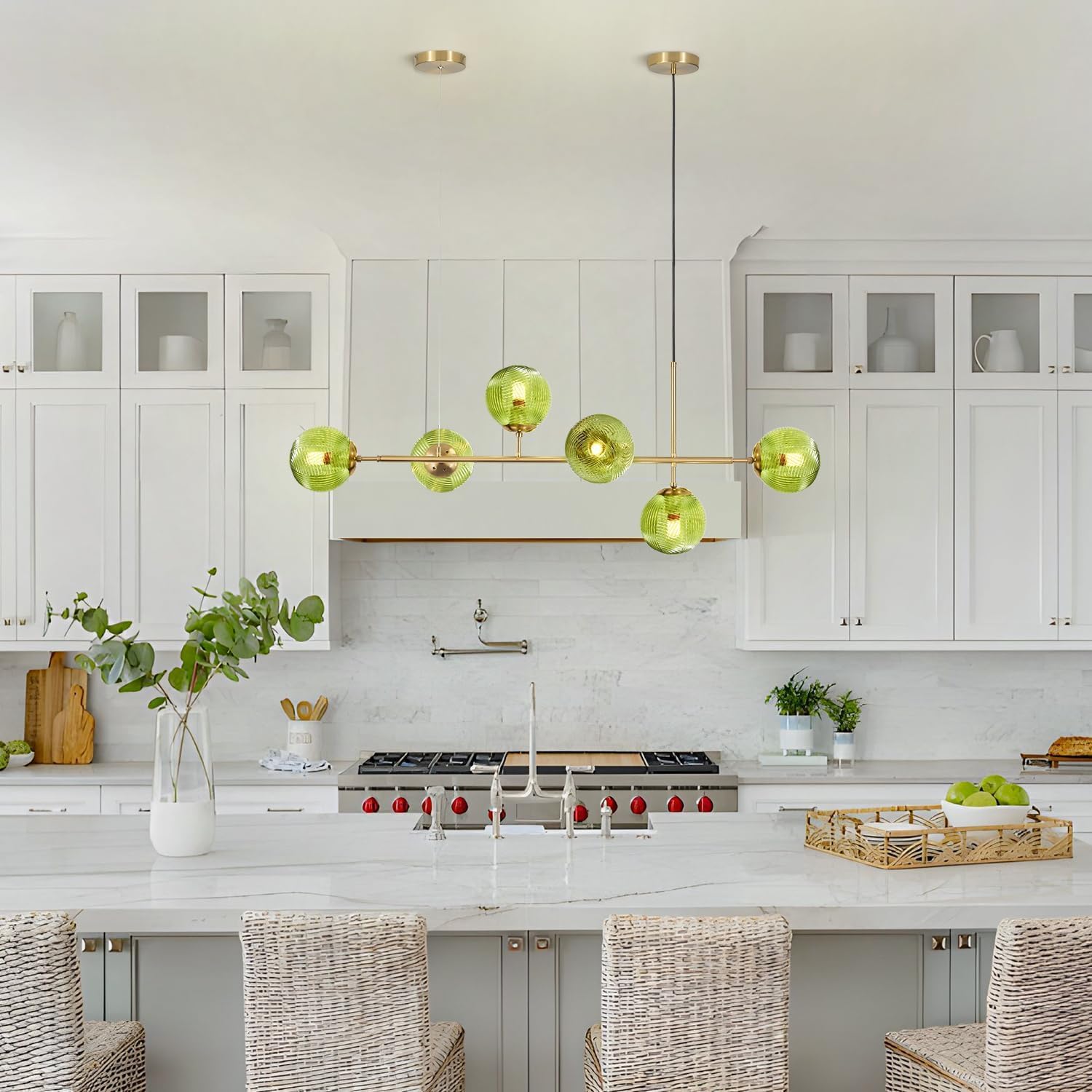 - Farmhouse Long Pendant Chandelier: The linear globe chandelier features a simple linear design with brushed gold finish and 6 green glass shade. The sputnik island lights for kitchen have an vintage look but also a fresh farmhouse style, can bring your space a noble feeling