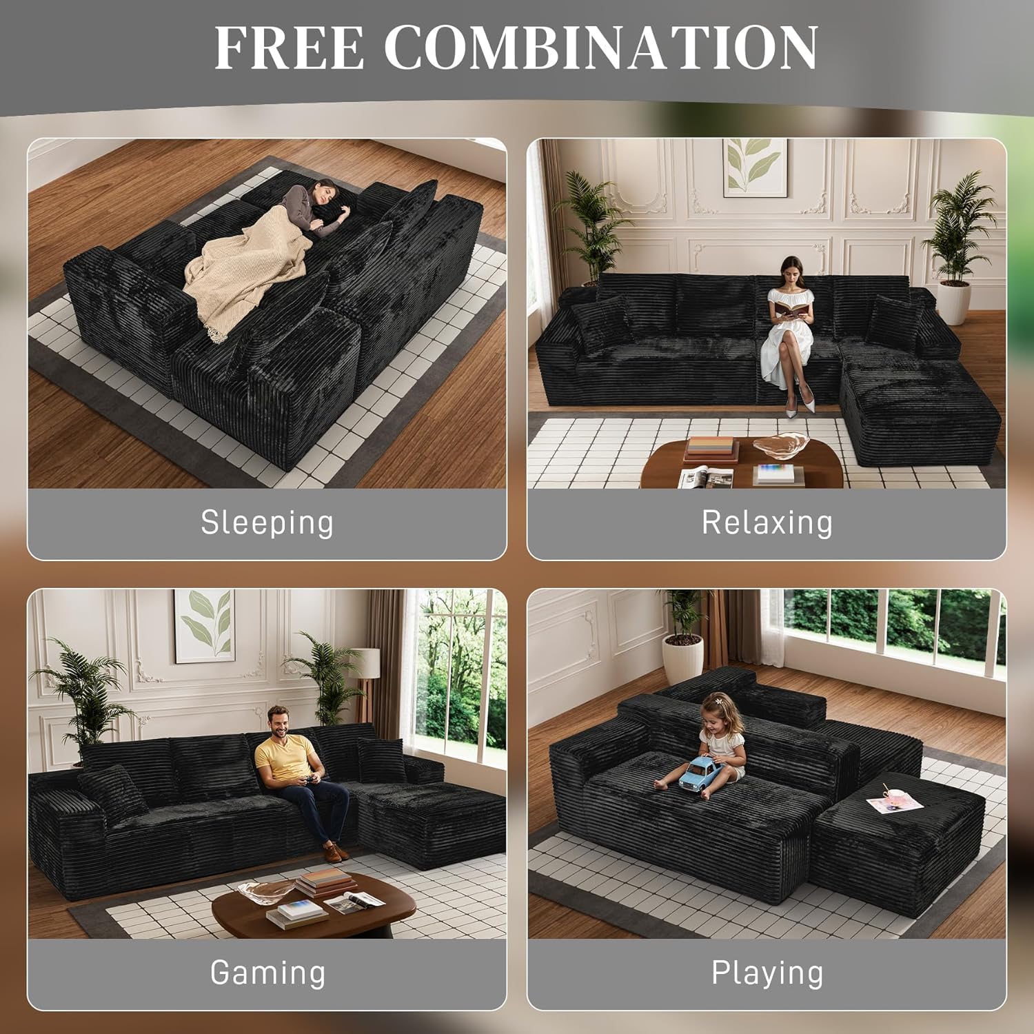 Modular Sectional Sofa Cloud Sectional Couch, 135" Comfy Fluffy L Shaped Black Couches for Living Room, Deep Seat Memory Foam Plush Corduroy Boneless Couch Sectionals with Right Facing Chaise Sofa