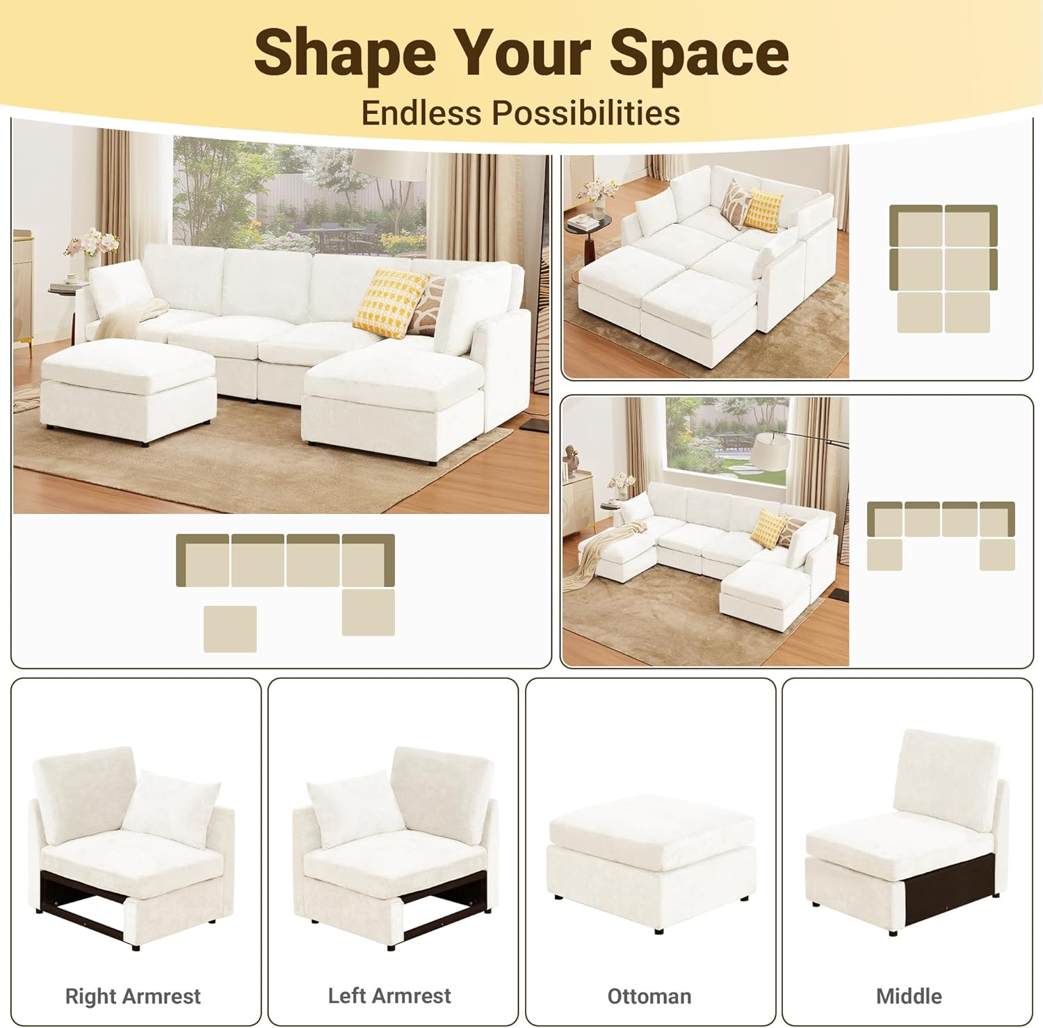 Tbfit U Shaped Couch, Sectional Sofa for Living Room,Chenille Cloud Couch with Ottoman 6 Seat, Beige