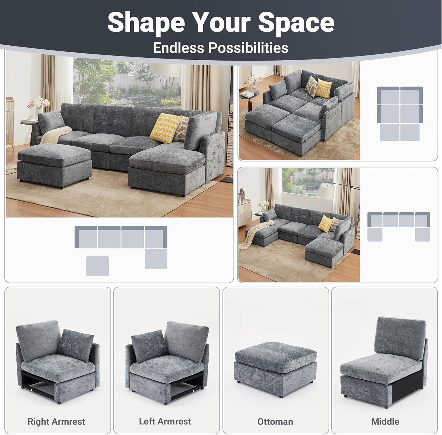 Tbfit U Shaped Couch, Sectional Sofa for Living Room,Chenille Cloud Couch with Ottoman 6 Seat, Grey