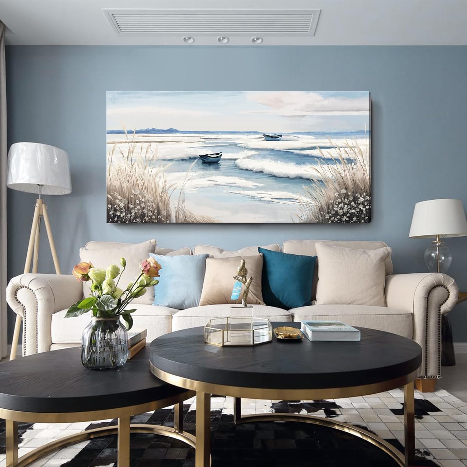 - Tranquil Wall Art for Every Space. Transform your walls with this stunning coastal canvas art featuring a serene seaside view, gentle waves, and two peaceful boats under a calming sky - ideal for a relaxing interior atmosphere.