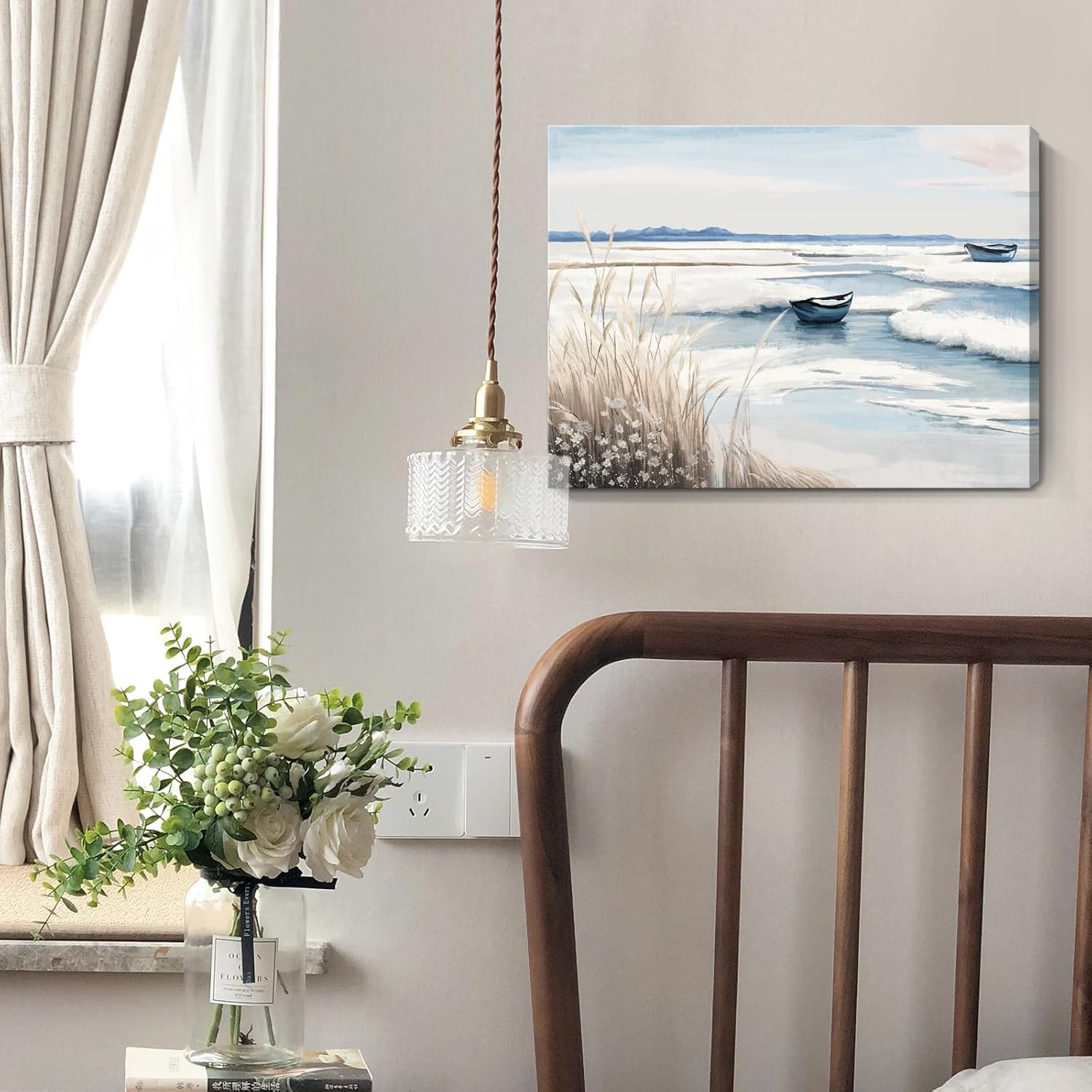amatop Coastal Wall Art - Nautical Ocean Canvas Print with Light Blue & White Seascape, Boat, Reeds - Beach Picture for Modern Farmhouse, Lake House, Bedroom, Bathroom, Beach-Themed Artwork,16x12
