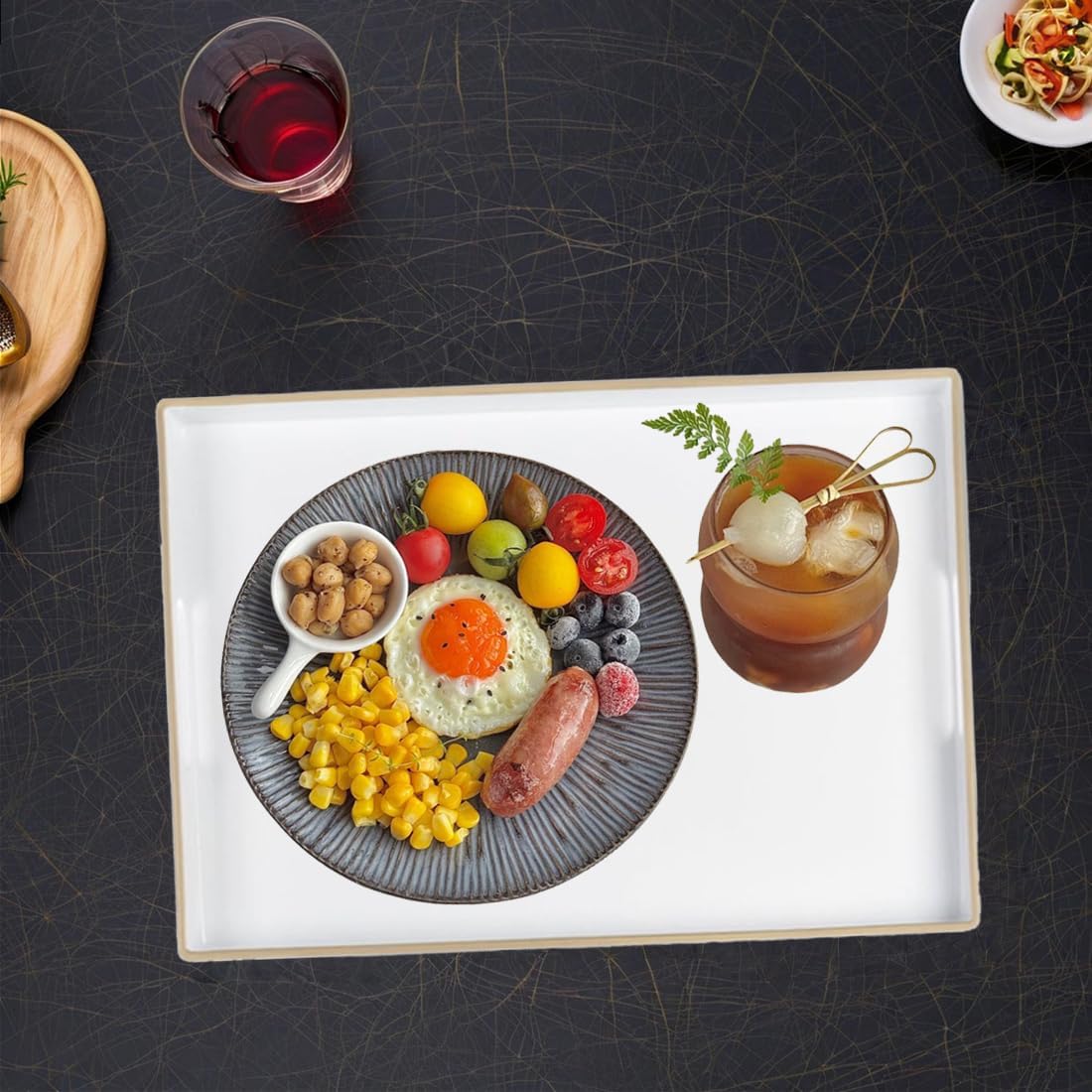 - Design: The size of the White tray is 15.7 x 11.8 inches, and it has two built-inhandles for easy carrying. lt has asimple, solid color finish with agolden top rim accent, and theedges are relatively smooth.