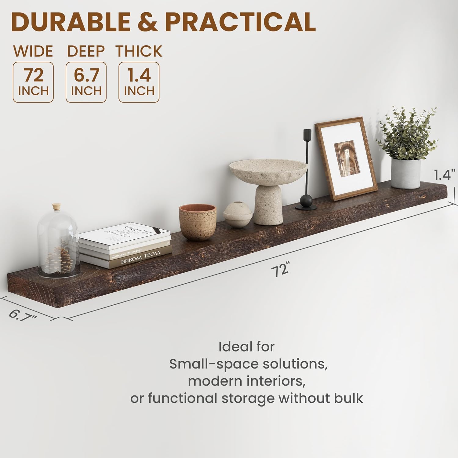 - IDEAL COMPACT SIZE: With a depth of 6.7 inches and 1.4 inches in thickness, these shelves fit perfectly in tight spaces like hallways, small kitchens, or above desks without overwhelming the room. The 6.7-inch depth offers generous storage for books, decor, kitchen essentials, or bathroom items while keeping a sleek, uncluttered look.