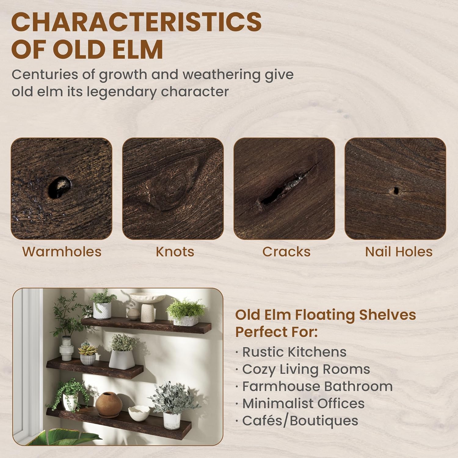- REAL SOLID ELM WOOD: These elegant elm wood floating shelves showcase the natural beauty of solid timber with a clean, minimalist design. The rich, warm tones and distinctive grain patterns of elm create organic visual interest, while the smooth, sanded surface offers a soft tactile feel.
