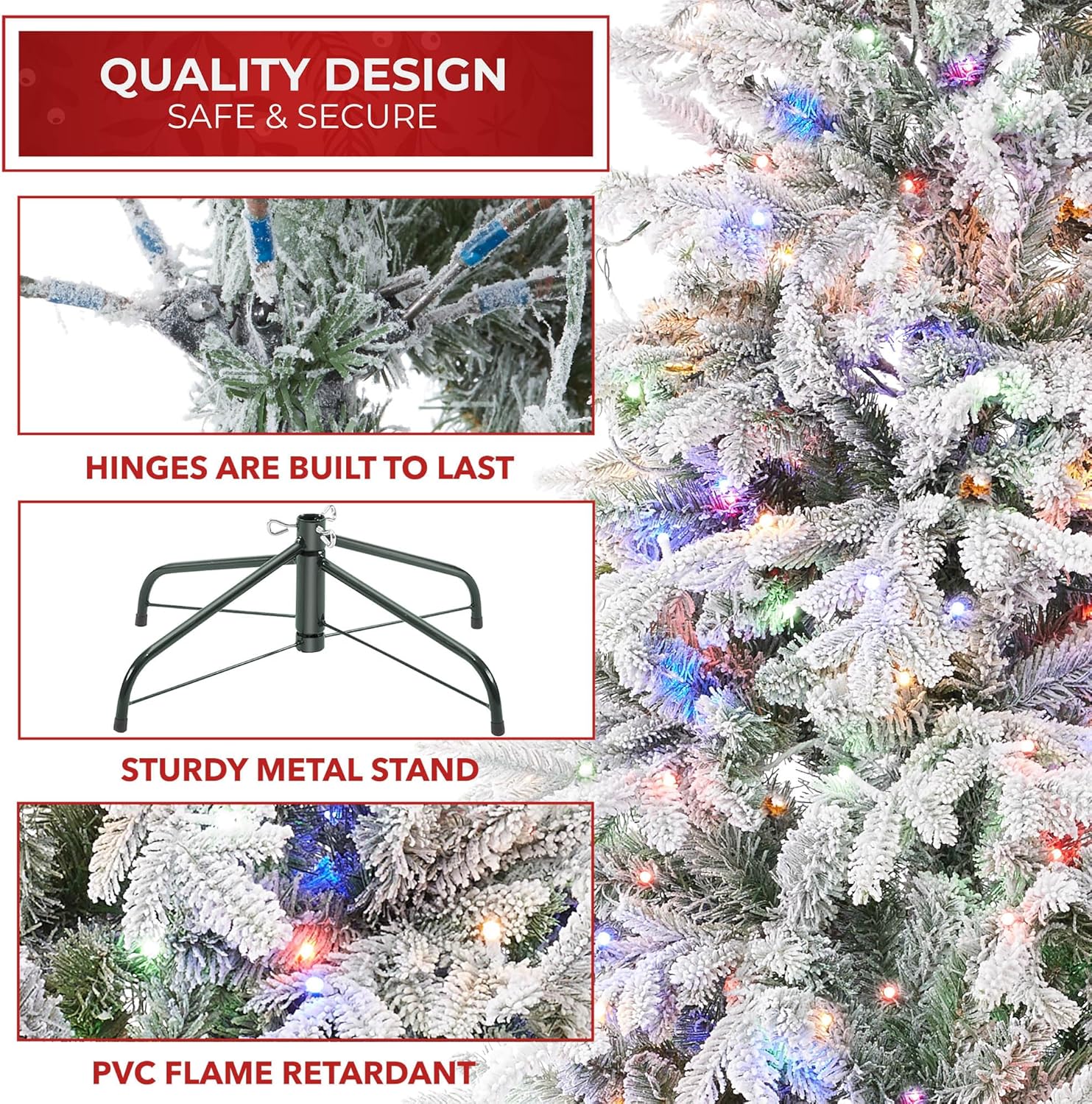 - Built to last: Constructed with premium grade materials, the branches and needles are both flame retardant and non-allergenic. Features hundreds of individually crafted pre-attached, hinged branch tips with durable metal hinges.