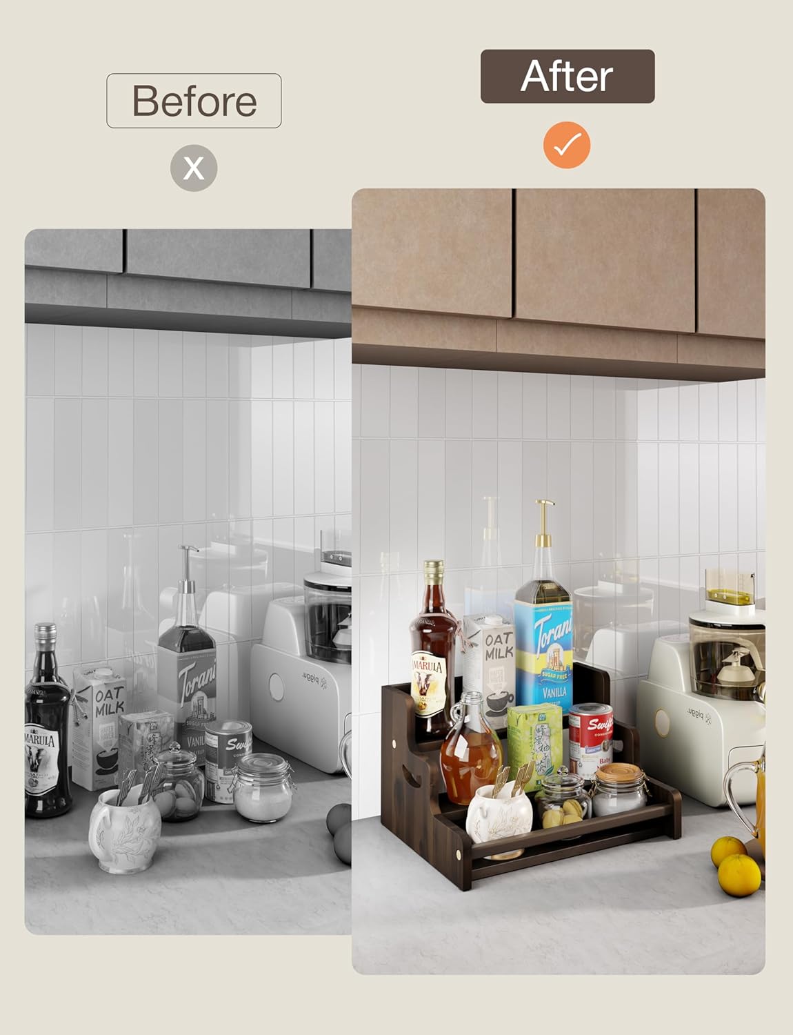 - Premium Acacia Wood: Crafted from thick, solid acacia wood with a smooth, polished surface, this wooden bar shelf brings natural warmth and durability. Its waterproof build keeps your bar accessories safe and your coffee syrup rack neat and clean.
