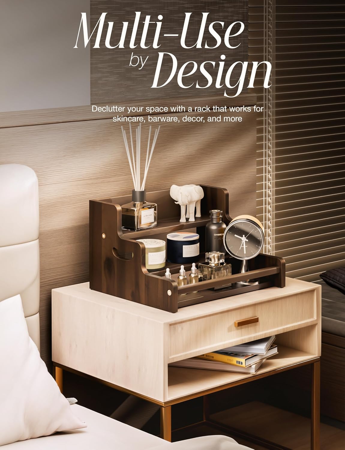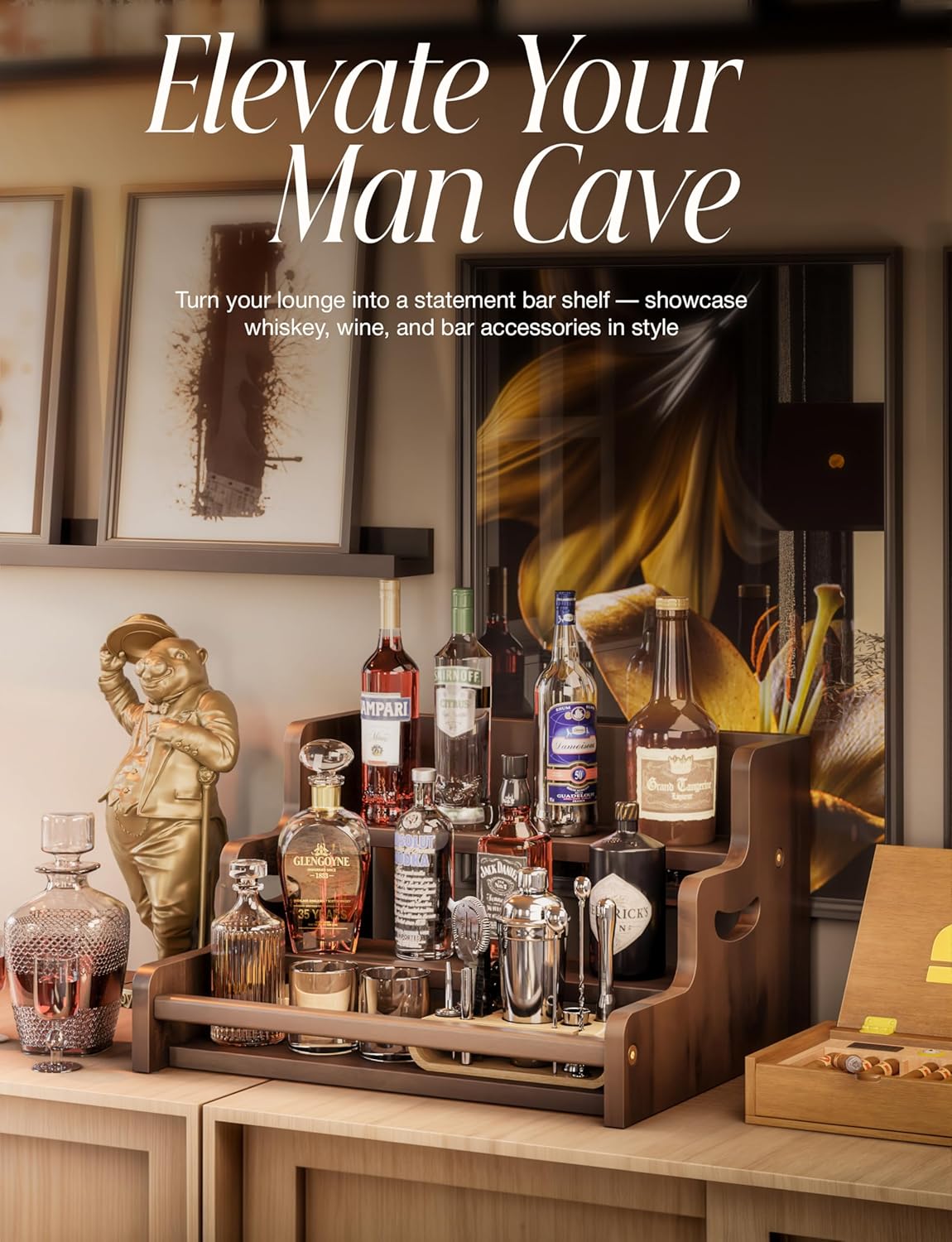 - Practical 3-Tier Stepped Shelf: The smart stepped design keeps bottles at different heights for clear visibility and easy access — ideal as a bottle organizer for countertop, wine holder, or liquor shelf to display whiskey, syrups, or collectibles with confidence.