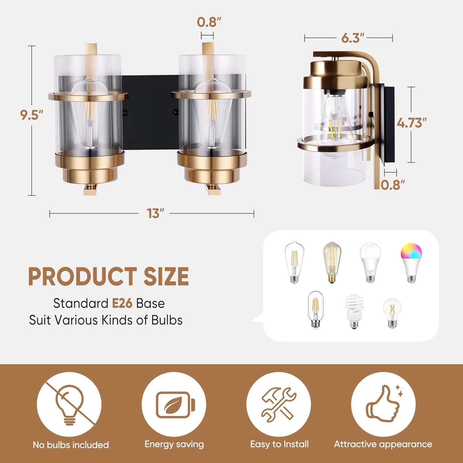 - ♥Medium Base Socket:This black gold bathroom light suggest to take one maximum 60 watt Medium base bulbs (incandescent, CFL or LED compatible). Bulbs not included.