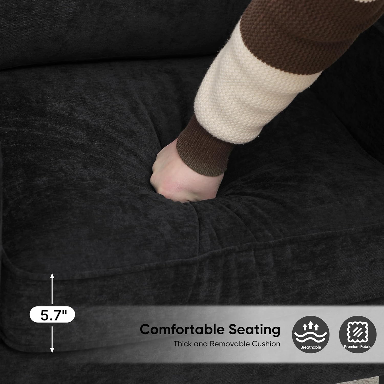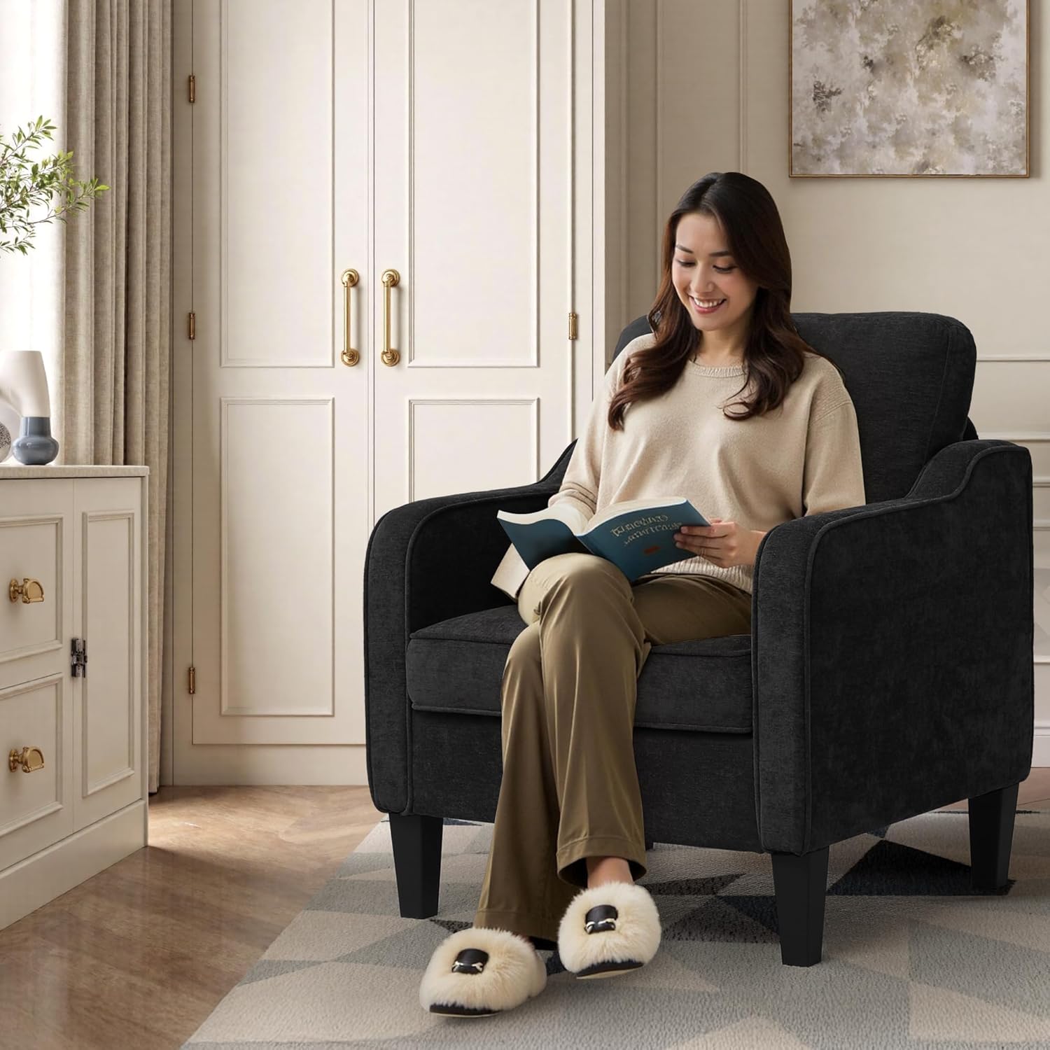 - 【Comfortable Seating】The 5.7" thick seat of this living room chair are padded with high-density foam for superior comfort. The armchair with 115° seating angle offers enhanced support, reduces lumbar fatigue and ensures a comfortable seating experience. The armrests are perfectly aligned with your arms, providing your hands with plenty of support for long hours of reading, resting or relaxing.