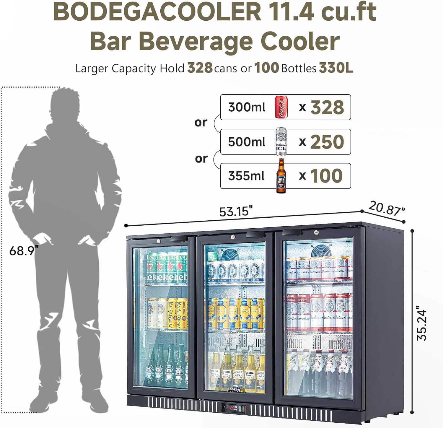 - [11.4 Cu. Ft Capacity Commercial Bar Refrigerator] This BODEGACOOLER Commercial Bar refrigerator measures 20.87"D x 53.15"W x 35.24"H. With a capacity of 11.4 cubic feet, this Commercial Bar refrigerator can easily hold up to 328 standard cans of soda. The interior of the Commercial Bar fridge has 6 adjustable shelves,allowing you to adjust the height of the shelves freely to accommodate the storage of different-sized drinks.