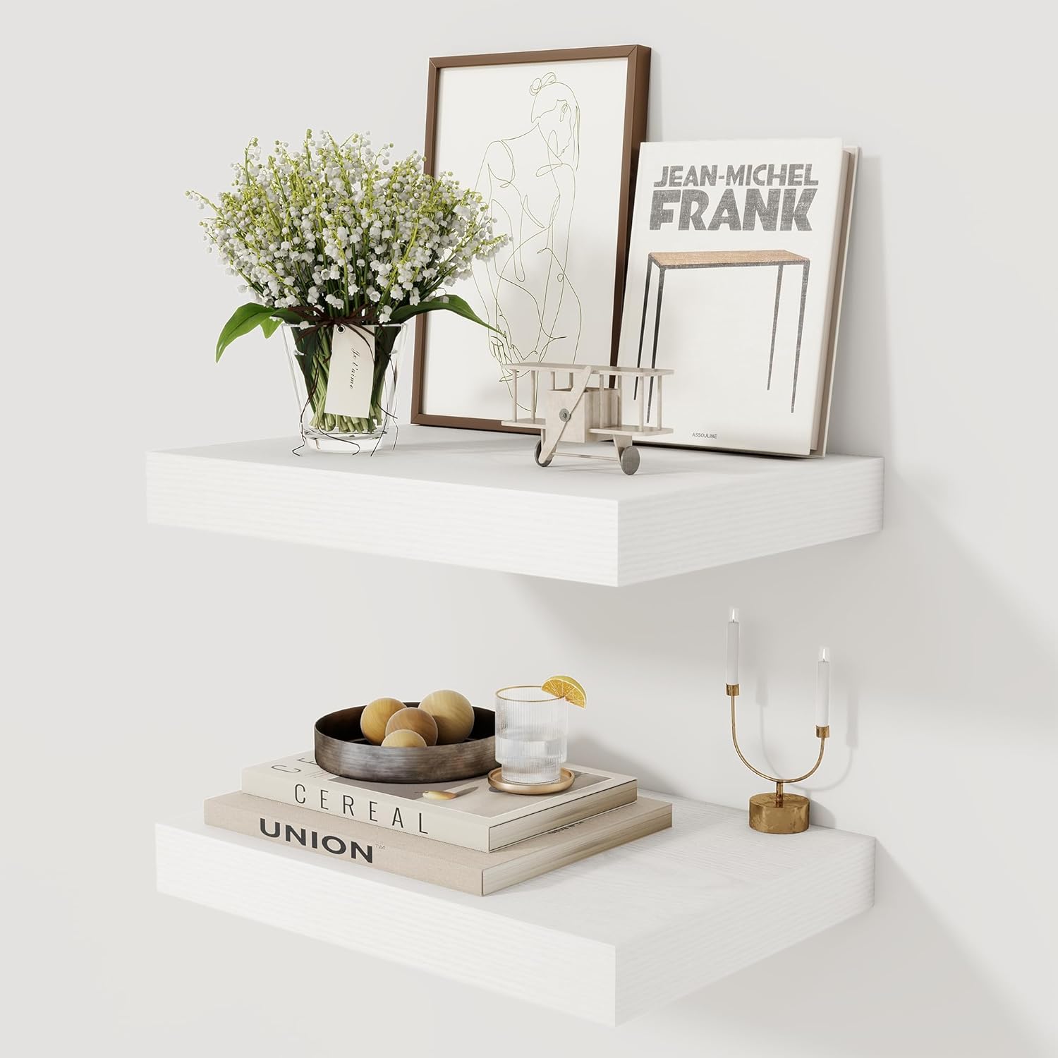 - ăFARMHOUSE RUSTIC WALL SHELFăThese floating shelves are made of premium engineered wood board and invisible one-piece bracket. The rustic wooden grain surface add character and warmth to any modern or traditional interior with these thick floating shelves, contrast shelves at staggering heights on the wall or mount side-by-side or in the corner for a clean streamlined look.
