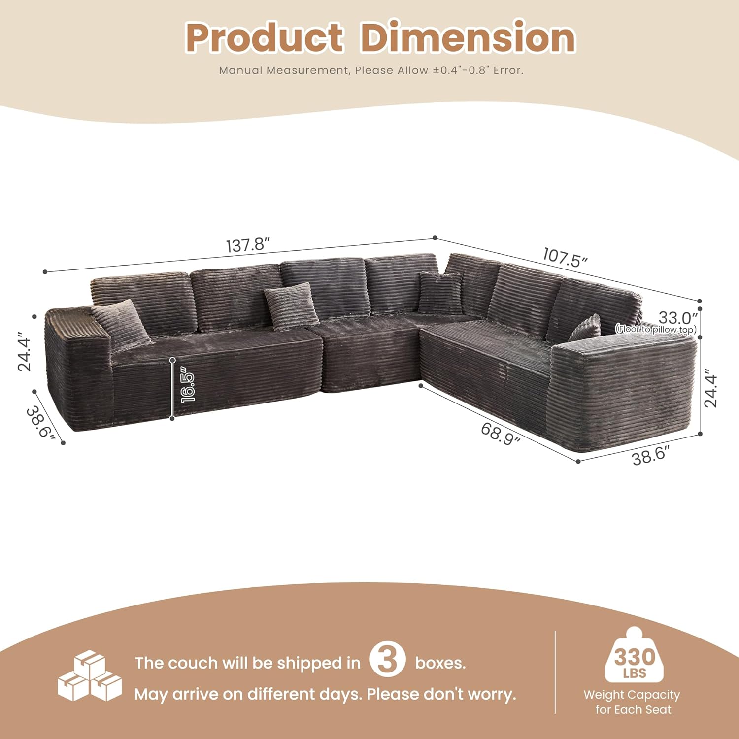 HOOOWOOO Cloud Sectional Couches for Living Room,Modular Sectional Sofa No Assembly,138X108 Inch Plush Corduroy Large L Shaped Floor Couch Set with Deep Seat(Gray)