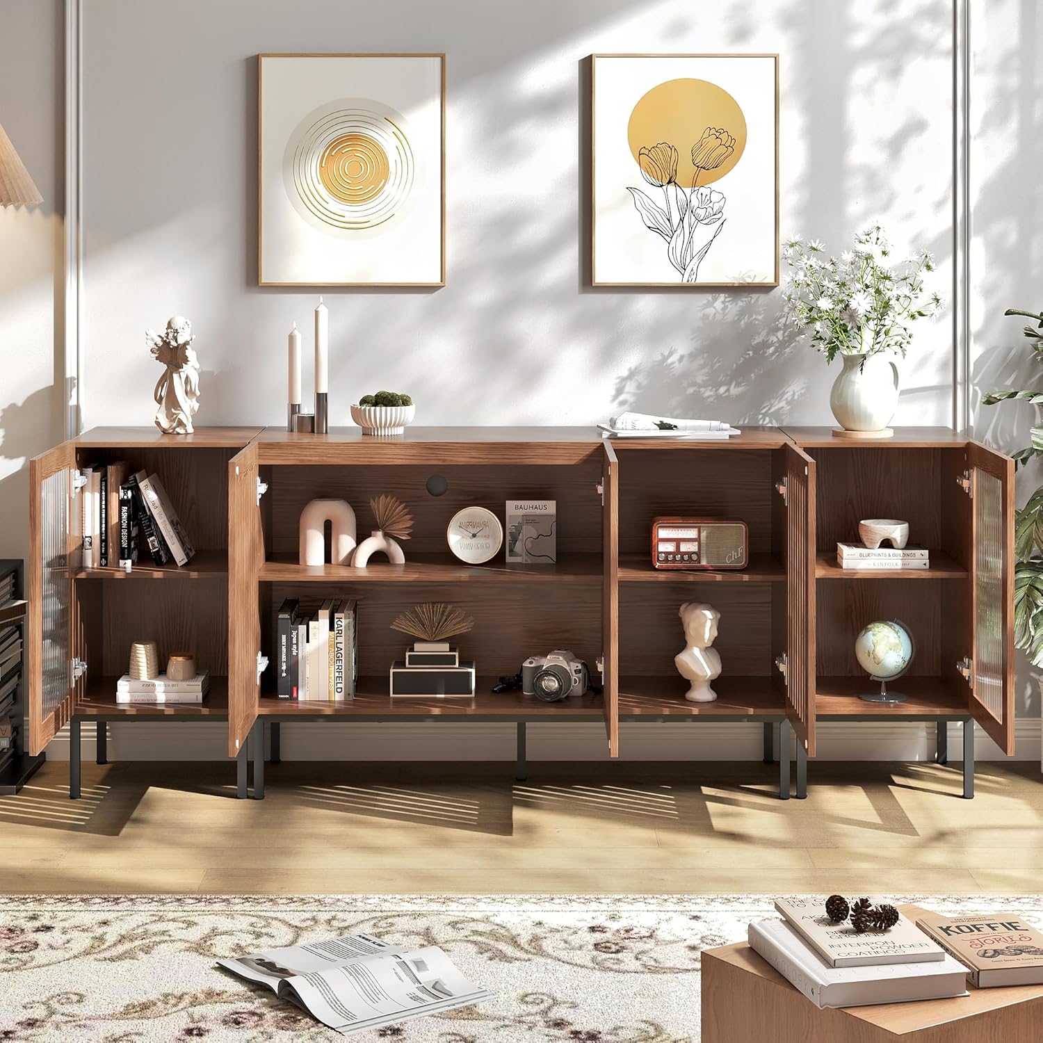 - Unique Design: This Farmhouse TV stand features 2 transparent tempered glass doors, designed to offer a clear and convenient view of your stored items. It allows you to showcase your favorite cutlery, wine glasses, bowls, and dishes, while simultaneously adding an artistic and elegant touch to your room.