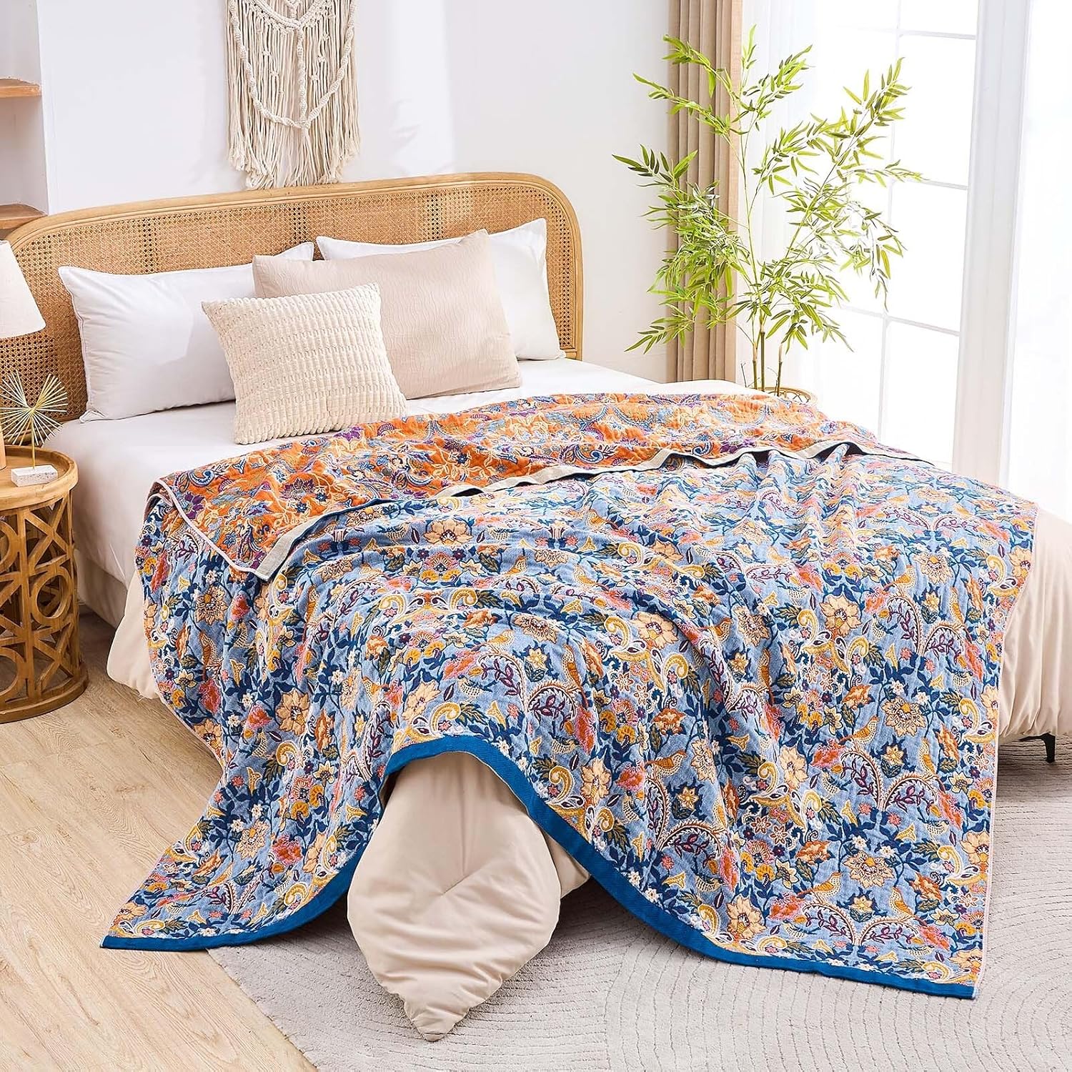 Boho Throw Blanket for Bed, 100% Cotton Soft Rustic Quilt Fall Blanket, 90"x98" Floral Printed Farmhouse Decor Bed Blankets, All Season Rustic Reversible Bohemian Throw Quilt