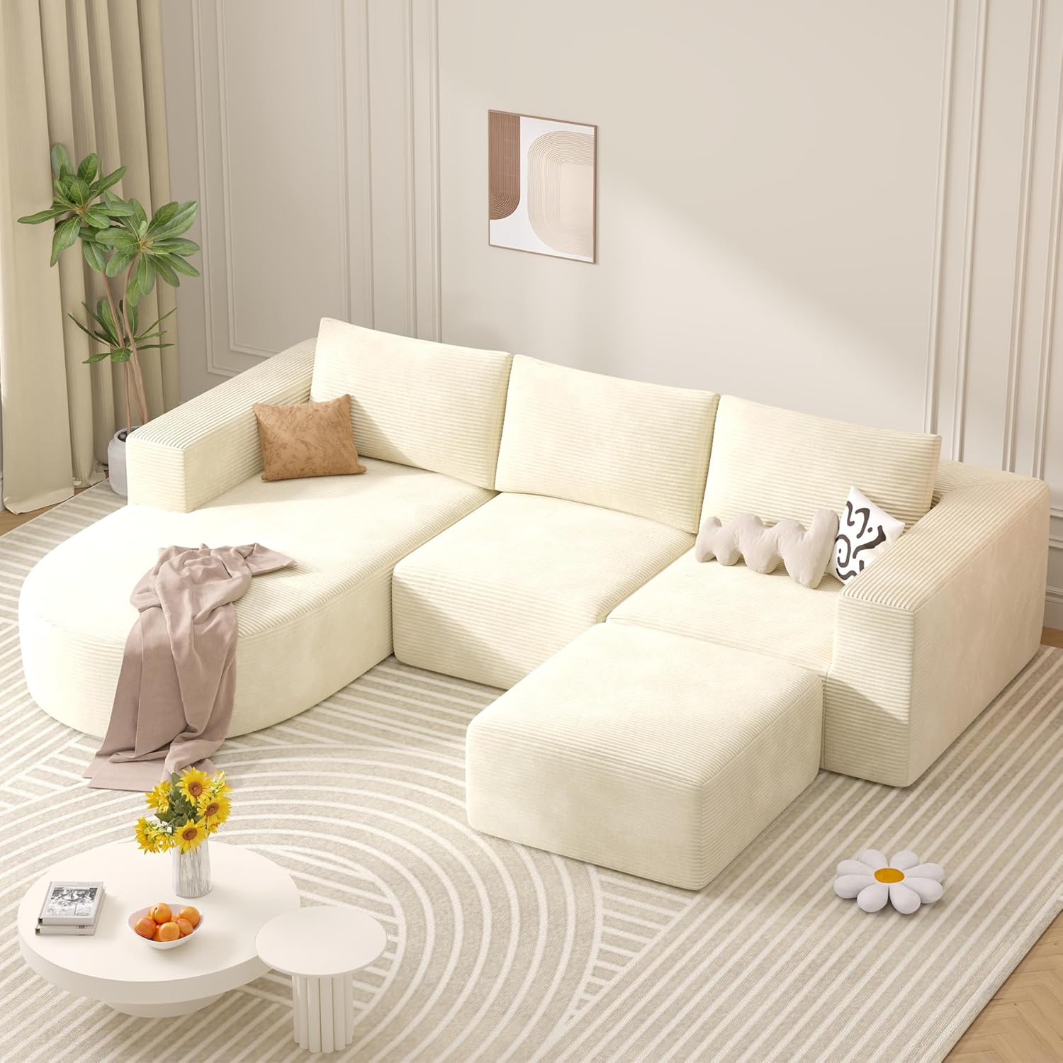 Modular Sectional Sofa with L-Shape Chaise,Cloud Sectional Modern Sleeper Couch with Deep Seat,Sponge Compression Sofas No Assembly Required (Beige-Corduroy Fabric) 1pcs
