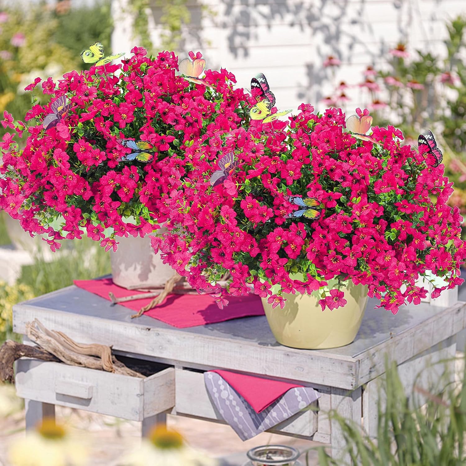 - Package Contents: This set includes 20 bundles of outdoor artificial flowers and 6 vivid faux butterflies(randomly color). Each fake outdoor plant features 7 flexible stems adorned with eucalyptus leaves and chrysanthemum blooms. Pot not included.