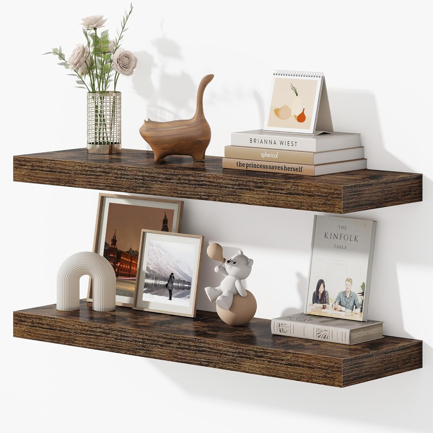 - Blending Rustic Warmth with Modern Style: These 32-inch hollow-core floating shelves perfectly combine the cozy charm of farmhouse design with a sleek, modern edge. Crafted from high-quality engineered wood, the natural-looking wood grain adds inviting texture and character to any space. Whether installed side-by-side, staggered, or tucked into a corner, they offer a clean, versatile look that complements both classic and contemporary dĂŠcor.