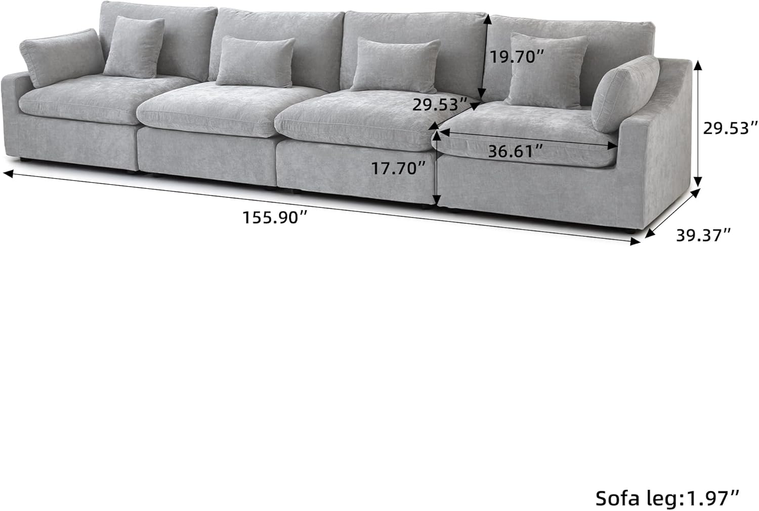 - ⛅[Size Information] Overall Size: 155.9"L x 39.37"W x 29.53"H. The cushion cover, backrest cover, and frame cover of the sofa can all be removeable and washable. You can easily keep the sofa clean.