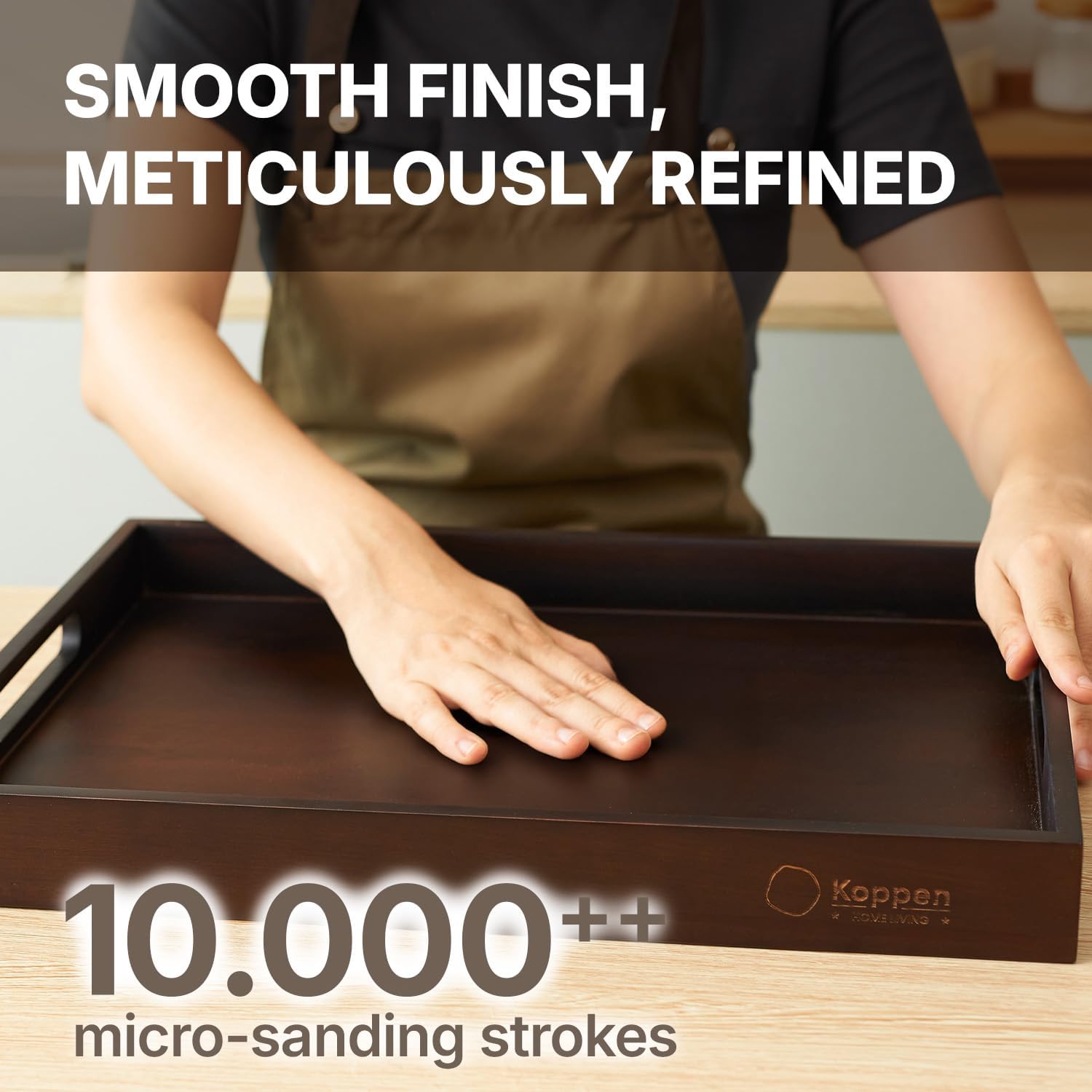 - [METICULOUSLY REFINED]: Our wooden serving tray is hand-finished through over 10,000 micro-sanding strokes—leaving the surface irresistibly soft, almost mental-like to the touch. Perfect as a wooden decorative tray, rectangle tray, or coffee tray for tray decor, it elevates food trays for eating, bed food trays for adults, serving platters and trays for parties, or party serving trays and platters.