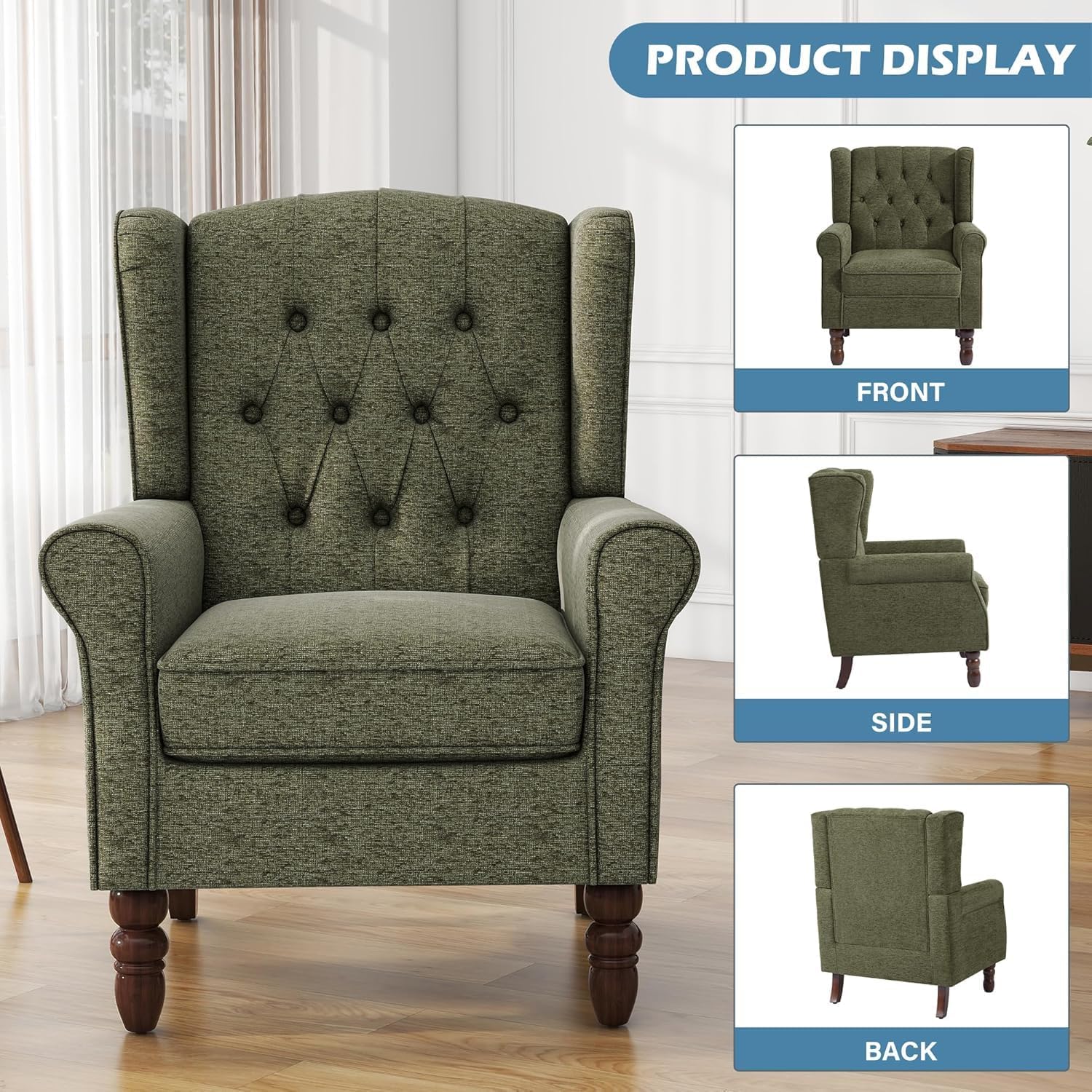 UIXE High Back Accent Chair, Upholstered Armchair in Fabric for Living Room, Retro Wingback Arm Chair Comfy Single Sofa Bedroom Reading Seat with Solid Wood Legs - Green