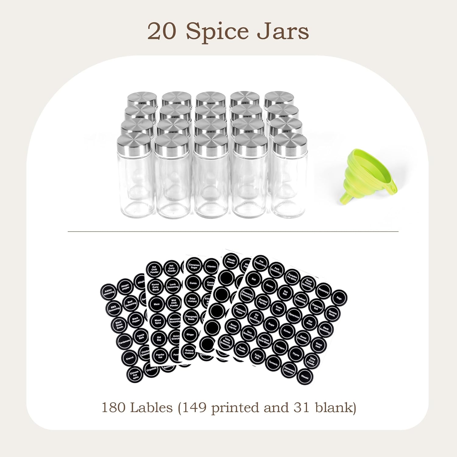 - 【All-Inclusive Set】Includes 20 airtight glass jars, funnel, 180 lables(149 printed and 31 blank), functional kitchen spice organizer.