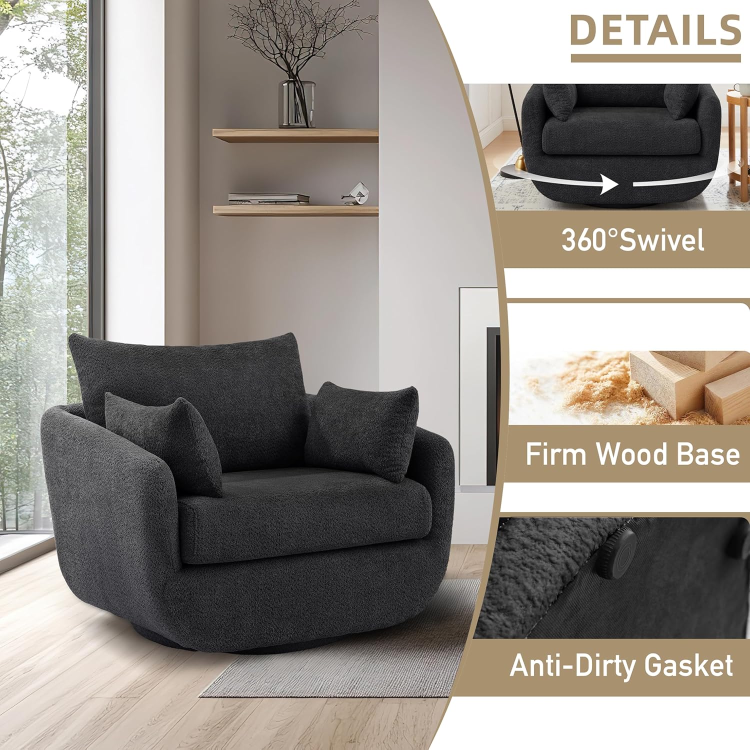 - Durable Construction & Floor-Friendly Design---Built to last with a 360° solid wood swivel base (supports 330 lbs) and reinforced steel frame,No wobbling, squeaking, or sudden drops,just silent, stable rotation perfect for conversations,With its swivel base, the chair can rotate fully, maximizing space utilization in smaller rooms.The wood he base is wrapped with black anti-dirty gaske also protects hardwood floors from scratches.