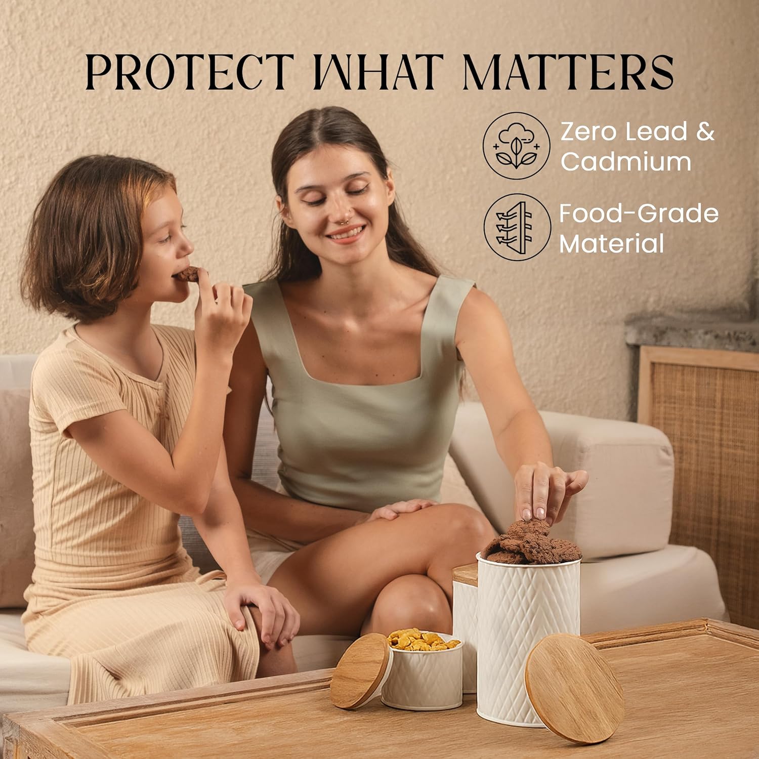 6 Canister Set for the Kitchen Countertop – Metal Food Storage Canisters with Airtight Lids for Flour, Tea, Crafts, Coffee, & Sugar – Container Set with Modern Wood Lids, White