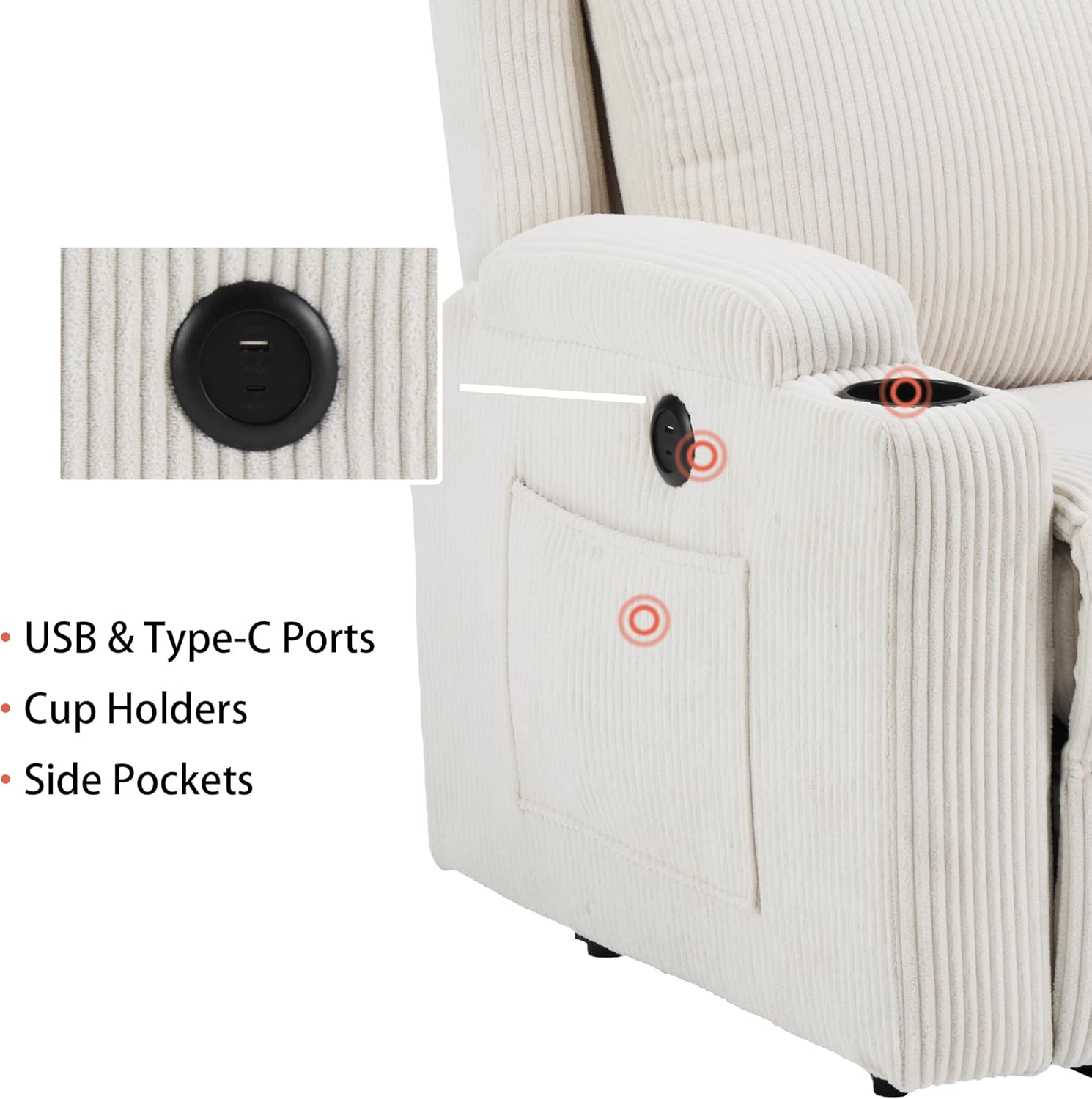 - 【Preferred Corduroy Fabric】: The recliner chair for the elderly is made of high-quality corduroy fabric, cut as a whole and precision hand-sewn. The fabric is thick and the fiber structure is tight and not easy to wear. The surface velvet strips have a unique texture and retro style, adding to the beauty of your living room or bedroom.There are also USB & Type-C charging ports on the side of the chair for your convenience.