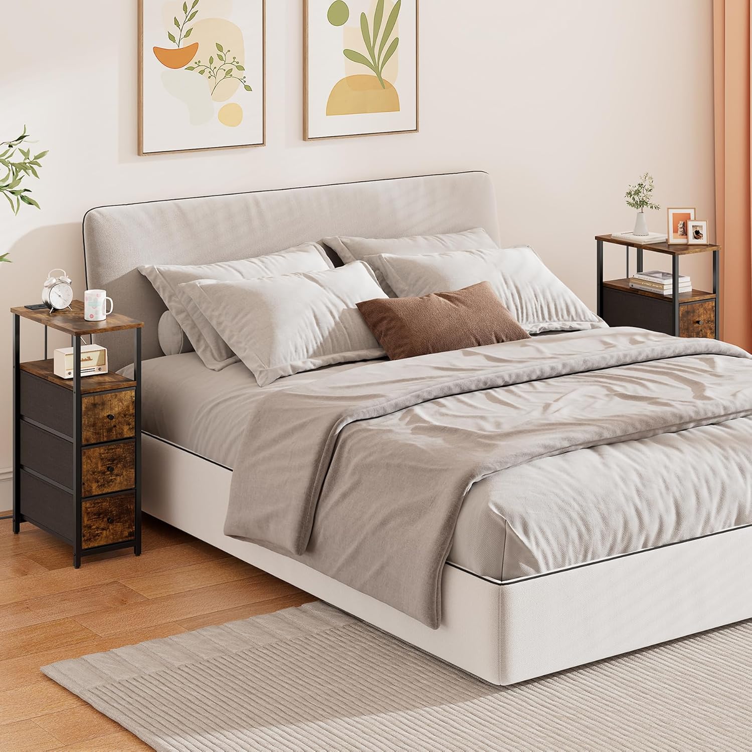 TUTOTAK Narrow Night Stand with Charging Station, Slim End Table with Plugins, Tall Side Table with 3 Fabric Drawer, Small Bedside Table with Storage, Living Room, Bedroom, Brown TB01BB086