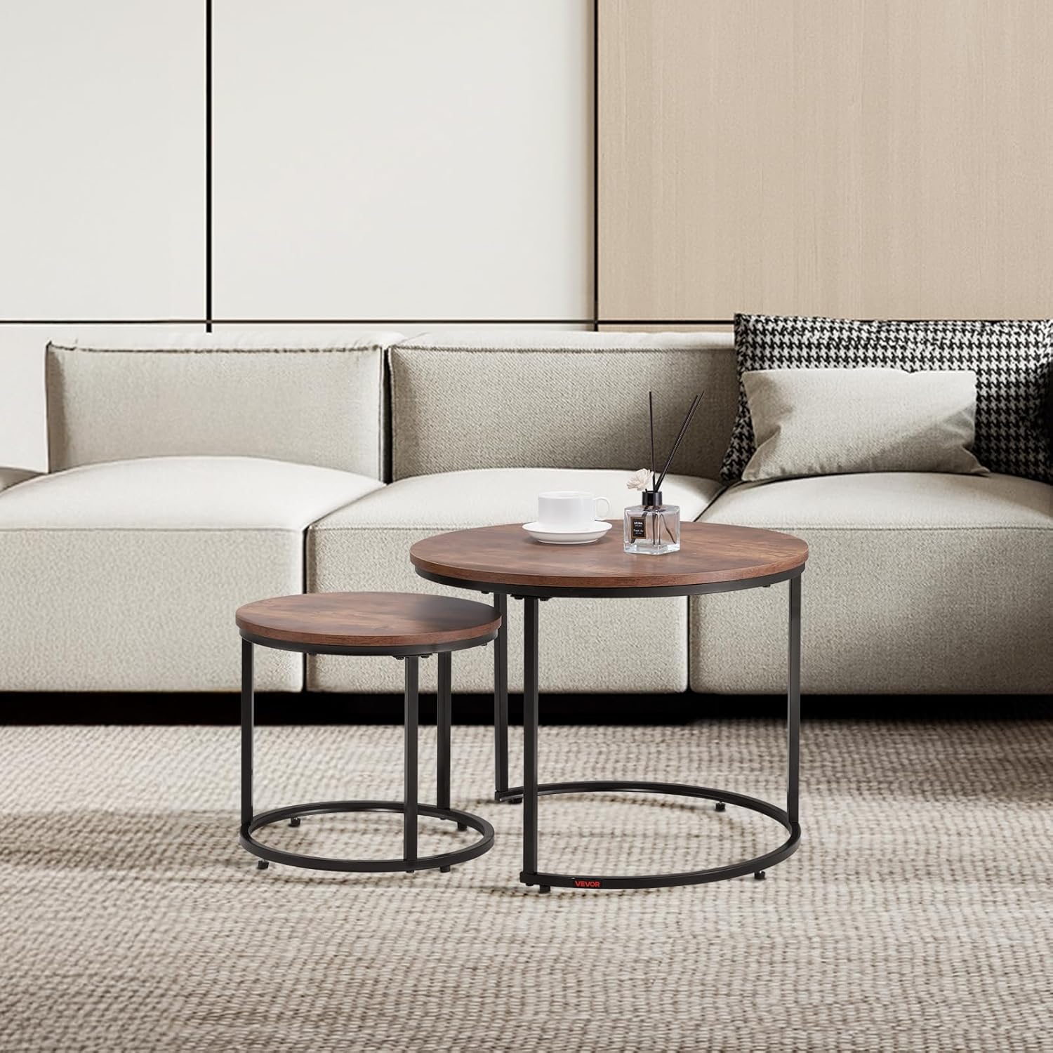 VEVOR Nesting Tables, Coffee Table Set of 2, 23.6 inch Round Coffee Table, Small Coffee Tables Night Stand with Metal Frame, for Living Room, Bedroom, Office (Brown & Black)