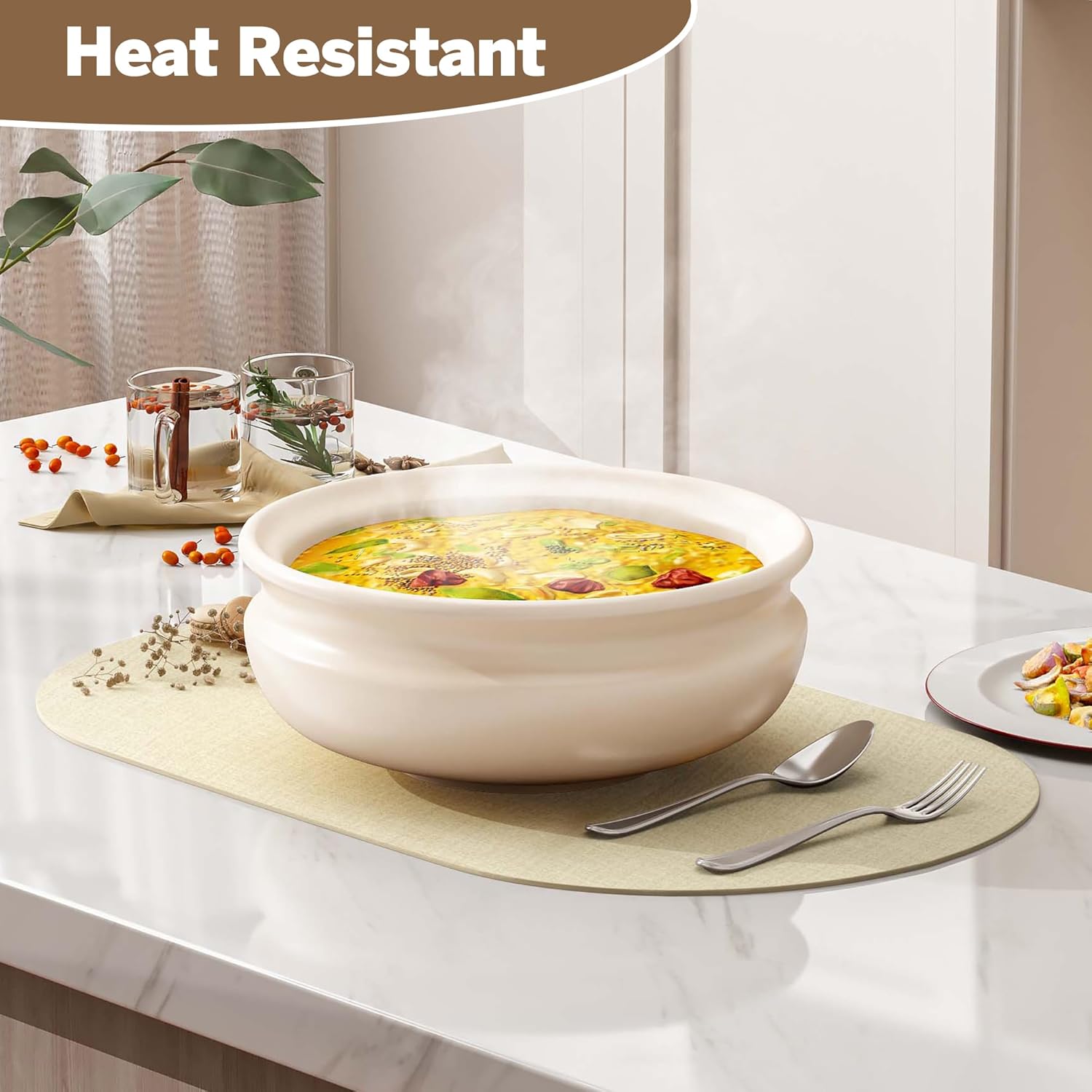 - 【Heat-Resistant Protection】These table placemats withstand temperatures up to 212°F (100°C), shielding your table from burns and heat marks. Their oversized dimensions of 13.8" x 21.6" easily fits dinner plates, wine glasses, and cutlery, preventing messes and keeping your table organized.