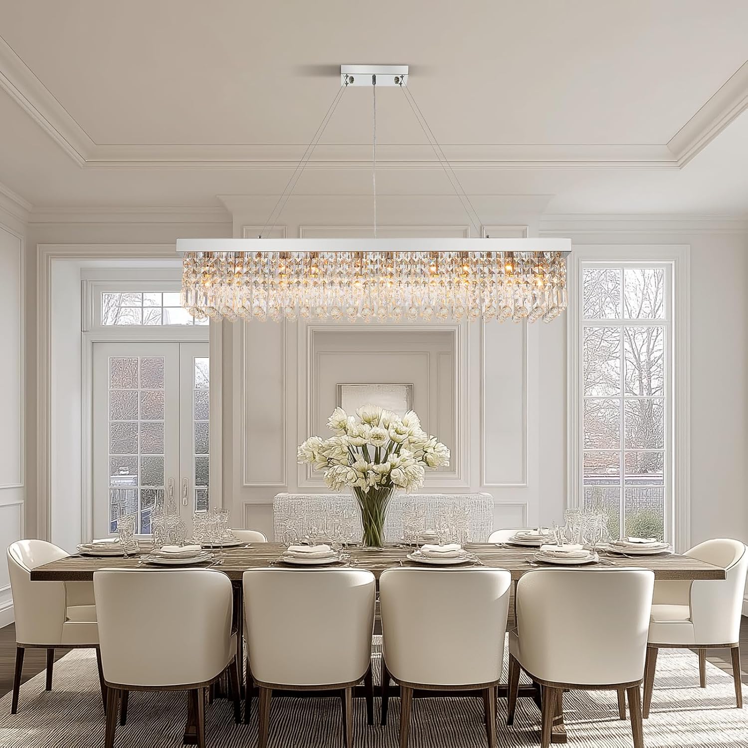 - IDEAL SIZE & ADJUSTABLE HEIGHT: This rectangular chandelier measures L47" x W10" x H10", a perfect size to illuminate dining tables or kitchen islands without overwhelming the space. The hanging wires are adjustable up to 59", allowing you to set the perfect height on flat or sloped ceilings for a tailored fit in dining rooms, kitchens, living rooms, and more.