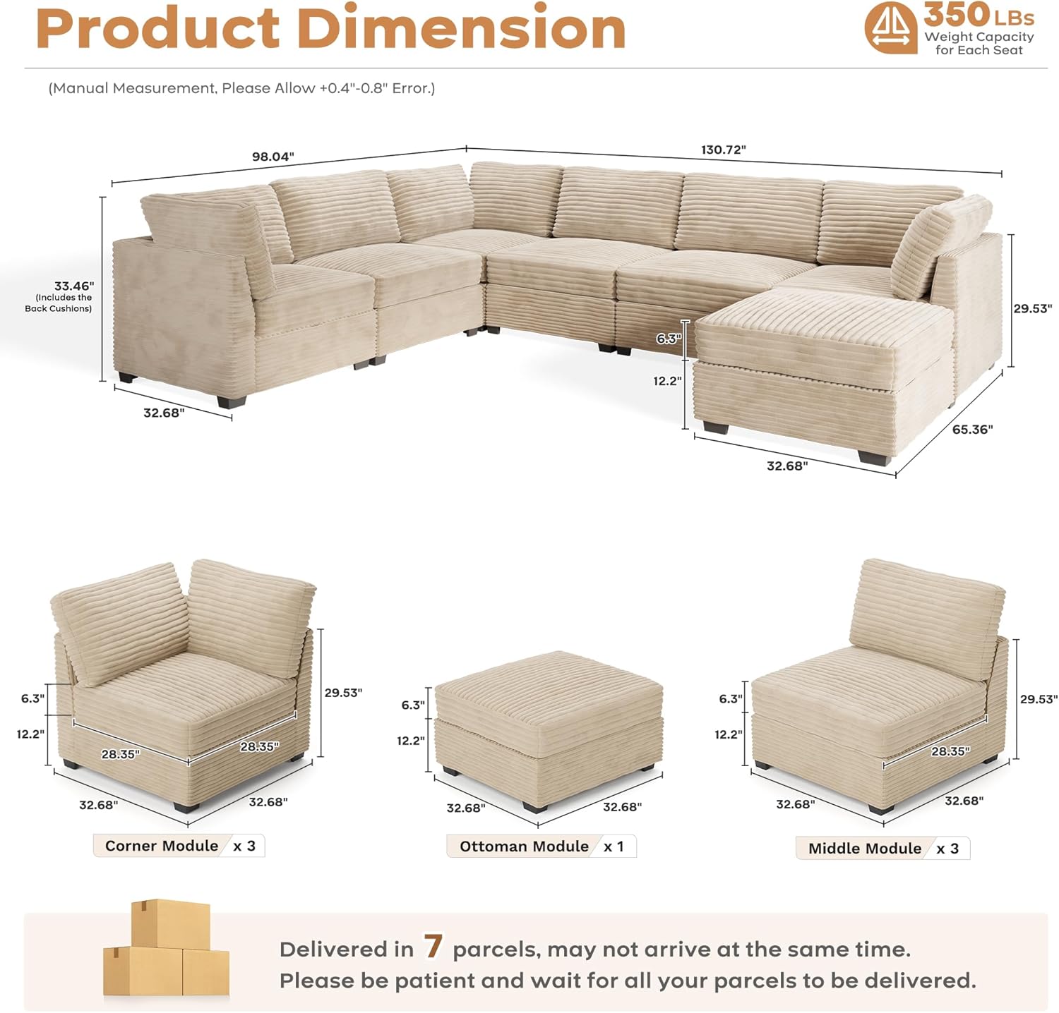 ovios Sectional Sofa Couch with U-Shape Chaise Sofa Bed, Comfy Modular Cloud Couches with Deep Seat, Modern Upholstered Plush Corduroy Sofas Set for Living Room, 7-Seater, Beige