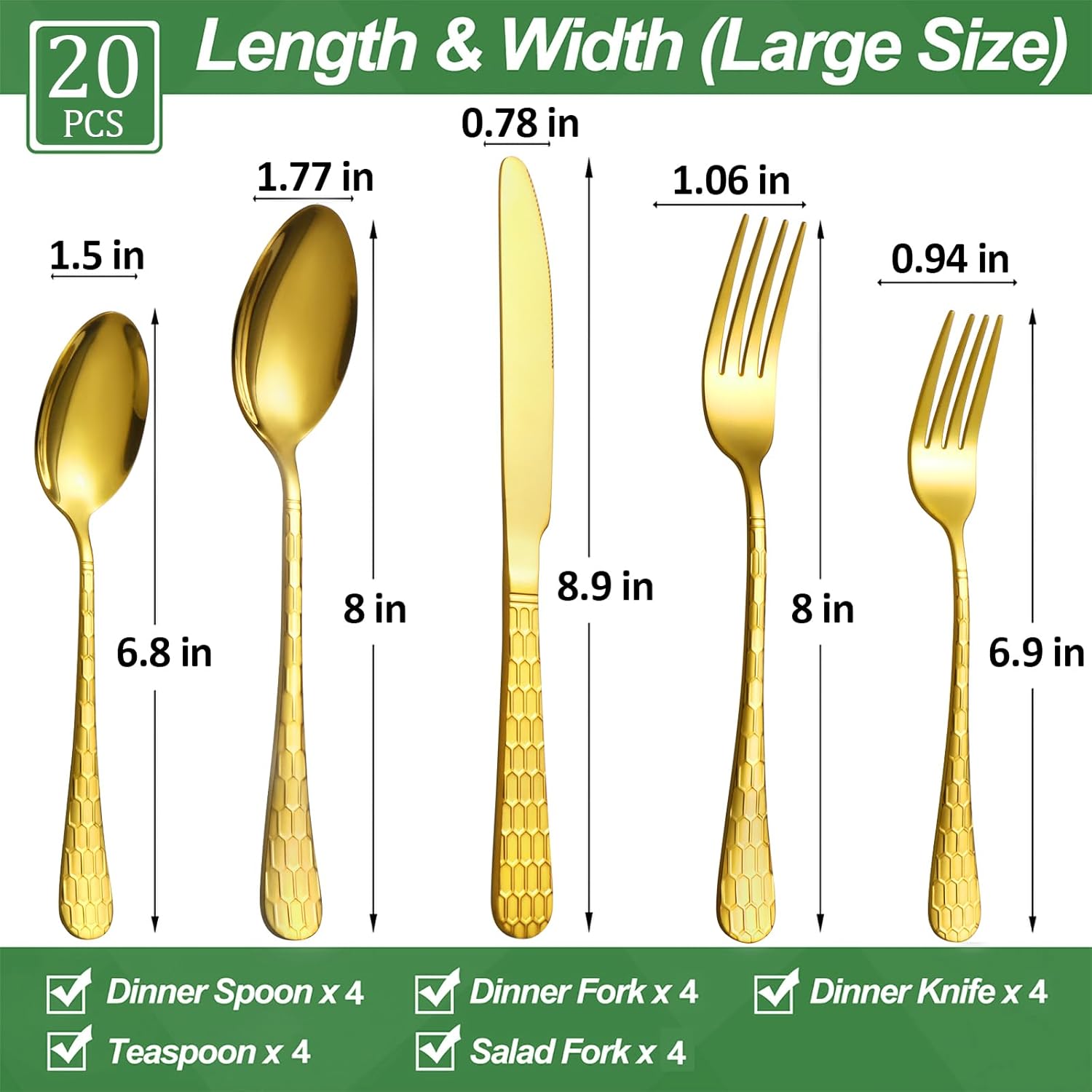 - 20 PIECE gold SILVERWARE SET, SERVICE FOR 4---This gold silver ware set contains: 4 dinner knives, 4 dinner forks, 4 salad forks, 4 dinner spoons and 4 teaspoons. Perfect stainless steel silverware for home, restaurant, family daily use, entertaining, wedding, outdoor dining, camping, dinner party, holiday usage and festival gathering. The silverware set is elegant and shiny.