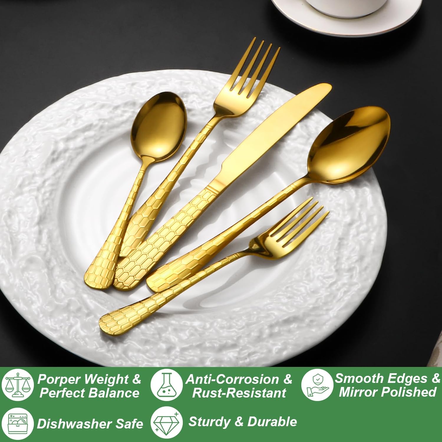 - WONDERFUL WORKMANSHIP AND FUNCTIONAL---Our gold utensils set is made of multiple mirror polishing treatment, silverware set with Water Cube handle design Each piece is beautifully adorned with a delicate Water Cube pattern,edge smooth , elegant and classical appearance, adding to the beautiful experience of everyday dining.