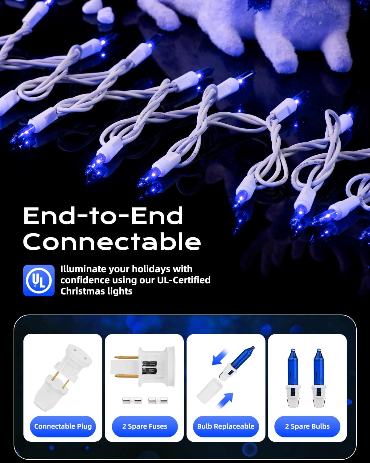 - 【Festive Mini Christmas Lights Set】This set includes 100 blue incandescent mini-lights on 26.5 ft white wire, with bulbs spaced 3-inche apart and 18-inch lead wire. Perfect for holiday decorating, with the ability to connect up to 5 light strings end-to-end;