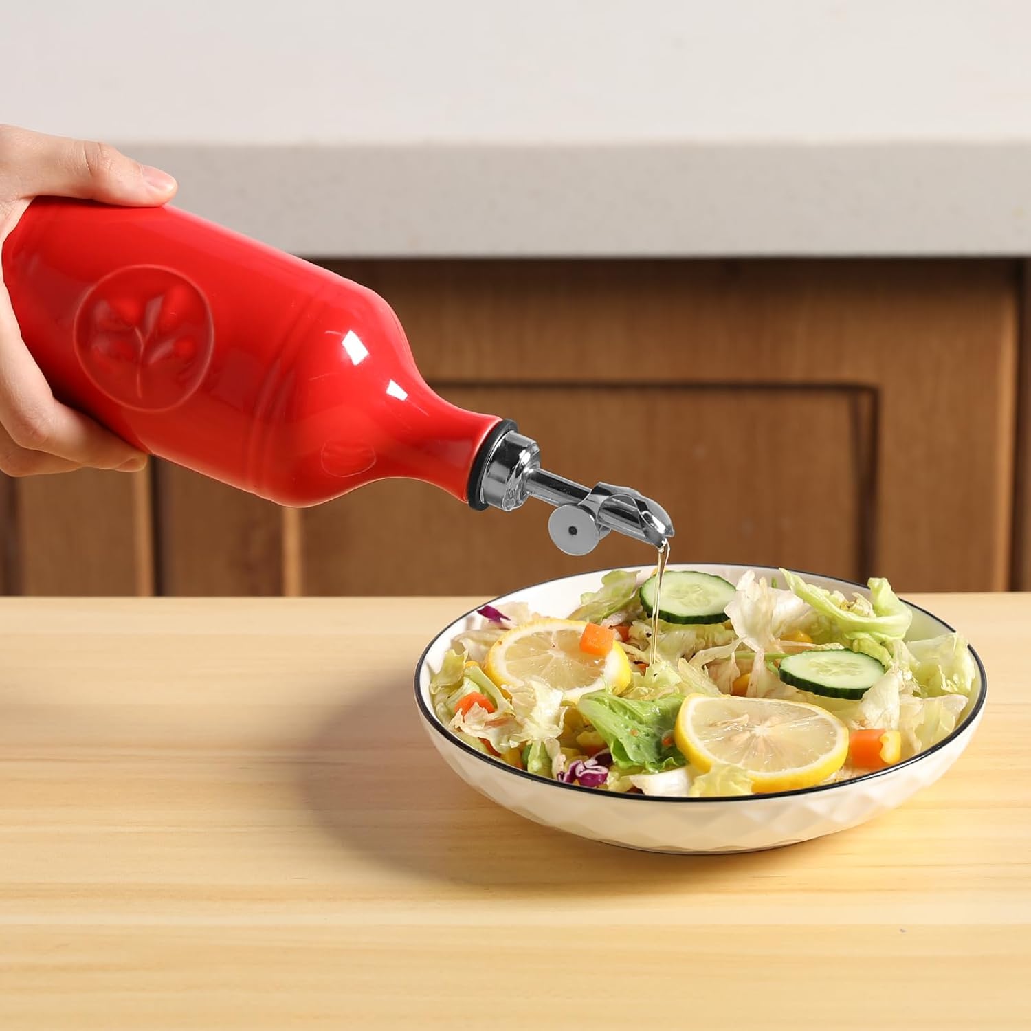 Sweejar 16 Oz Ceramic Olive Oil Dispenser Bottle, Oil Dispenser for Kitchen with Gravity Spout, Relief Opaque Oil Container for Evoo, Avocado Oil, Vinegar, Soy Sauce, 1 Pack(Red, Silver Spout)
